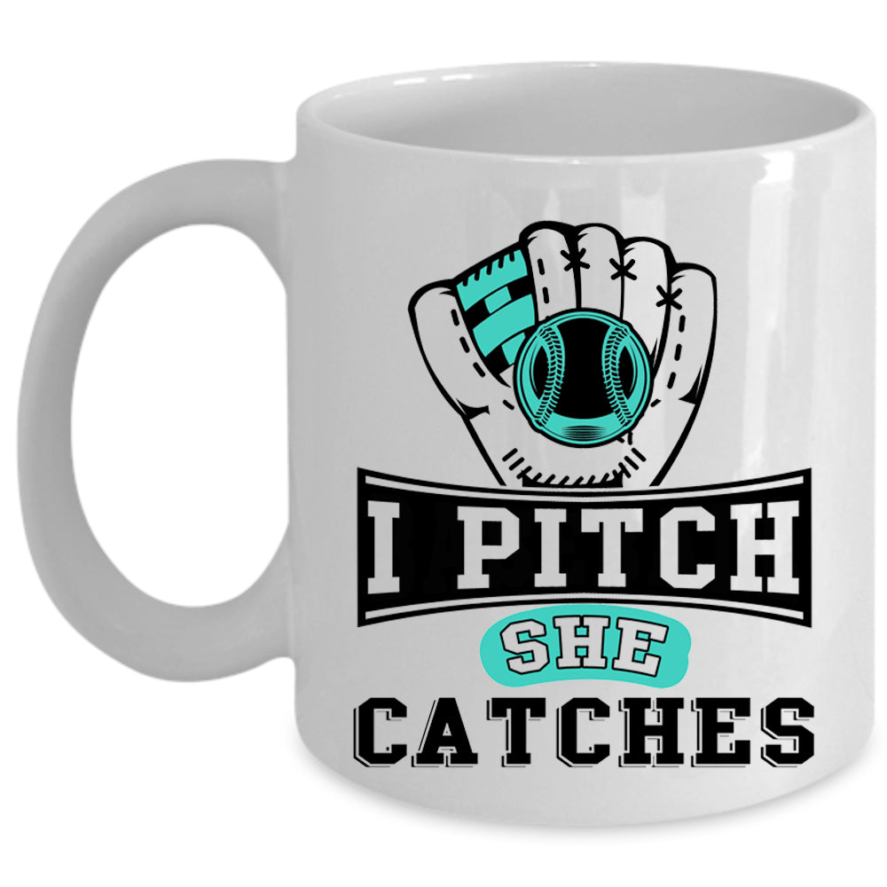 Cool Softball Coffee Mug, I Pitch She Catches Cup