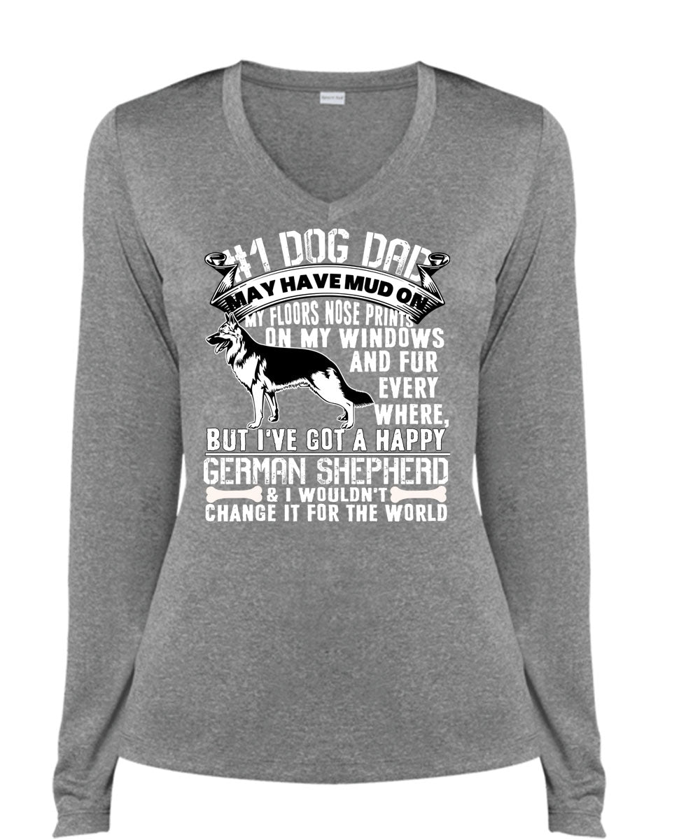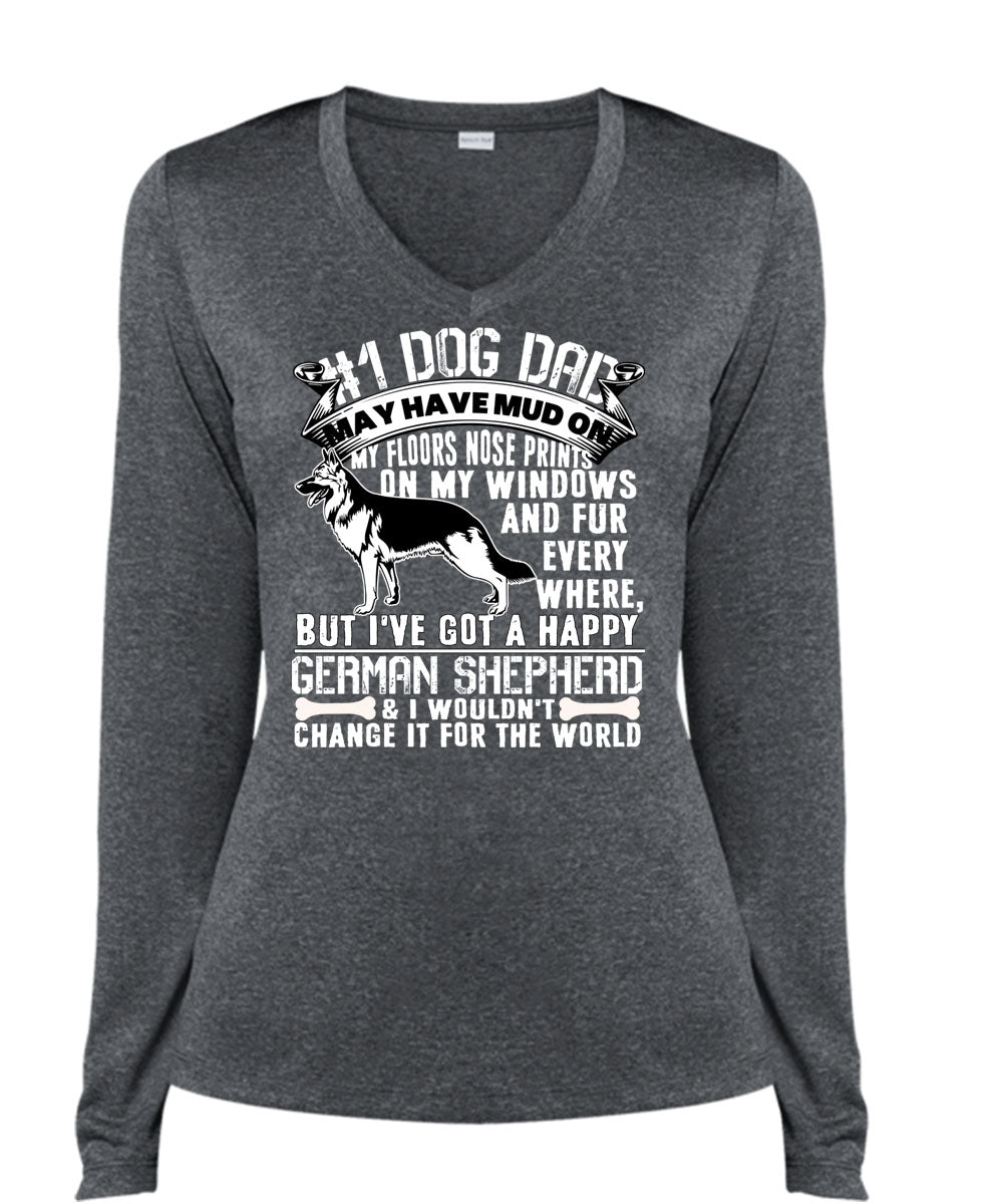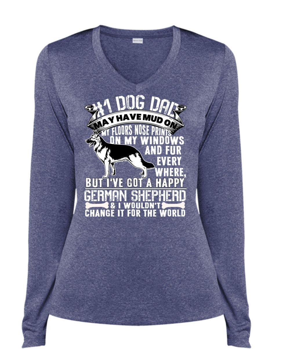 Dog Dad May Have Mud T Shirt, I've Got A Happy German Shepherd T Shirt, Cool Shirt (Ladies LS Heather V-Neck)