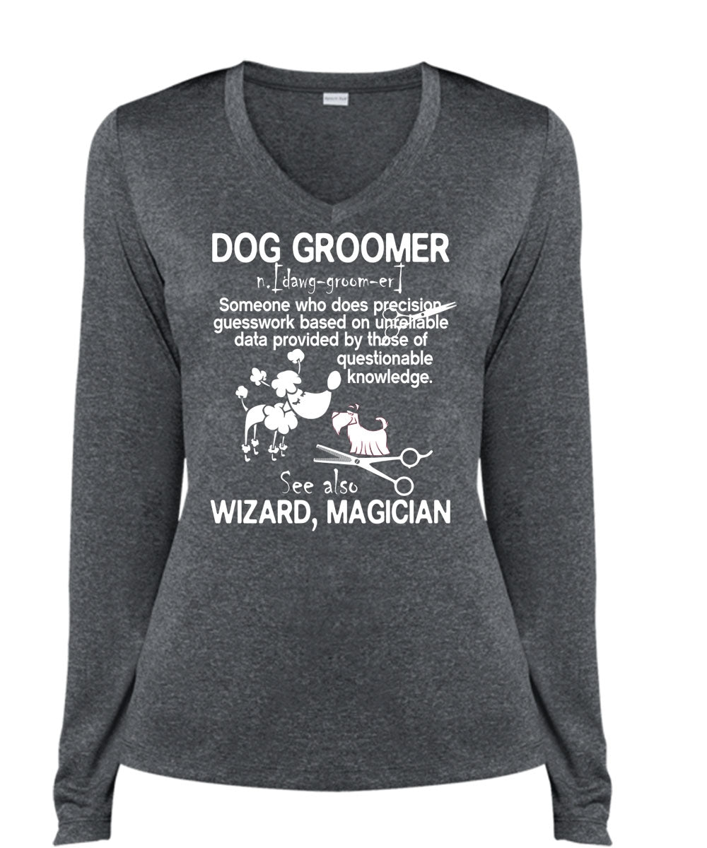 Dog Groomer T Shirt, See Also Wizard Magician T Shirt, Cool Shirt (Ladies LS Heather V-Neck)