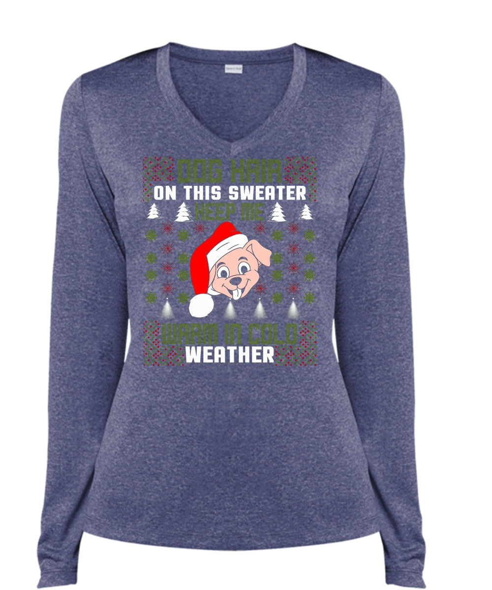 Dog Hair On This Sweater T Shirt, Warm In Cold Weather T Shirt, Cool Shirt (Ladies LS Heather V-Neck)