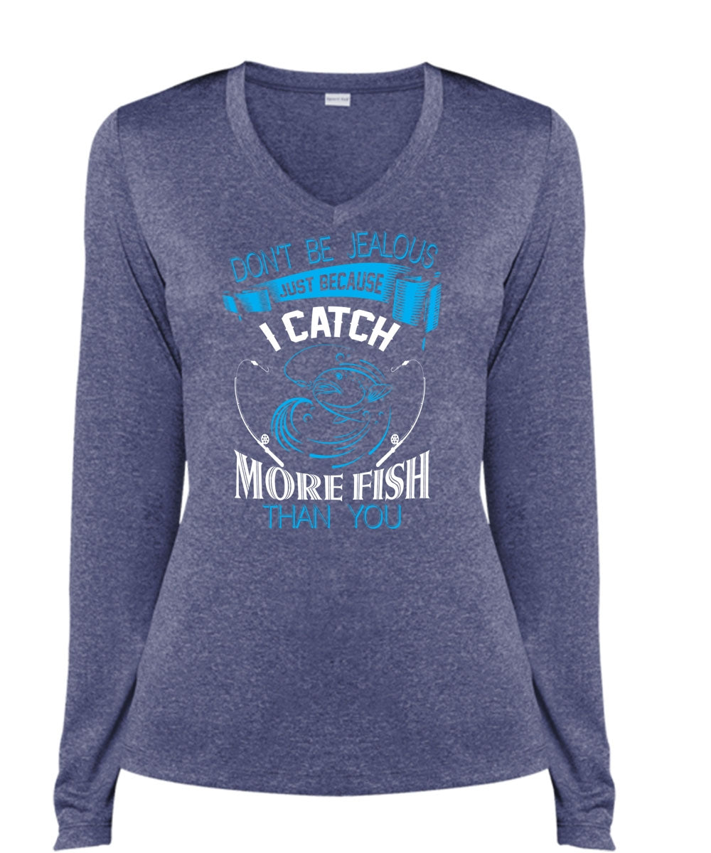 Don't Be Jealous Just Because I Catch More Fish Than You T Shirt, Fisherman T Shirt (Ladies LS Heather V-Neck)