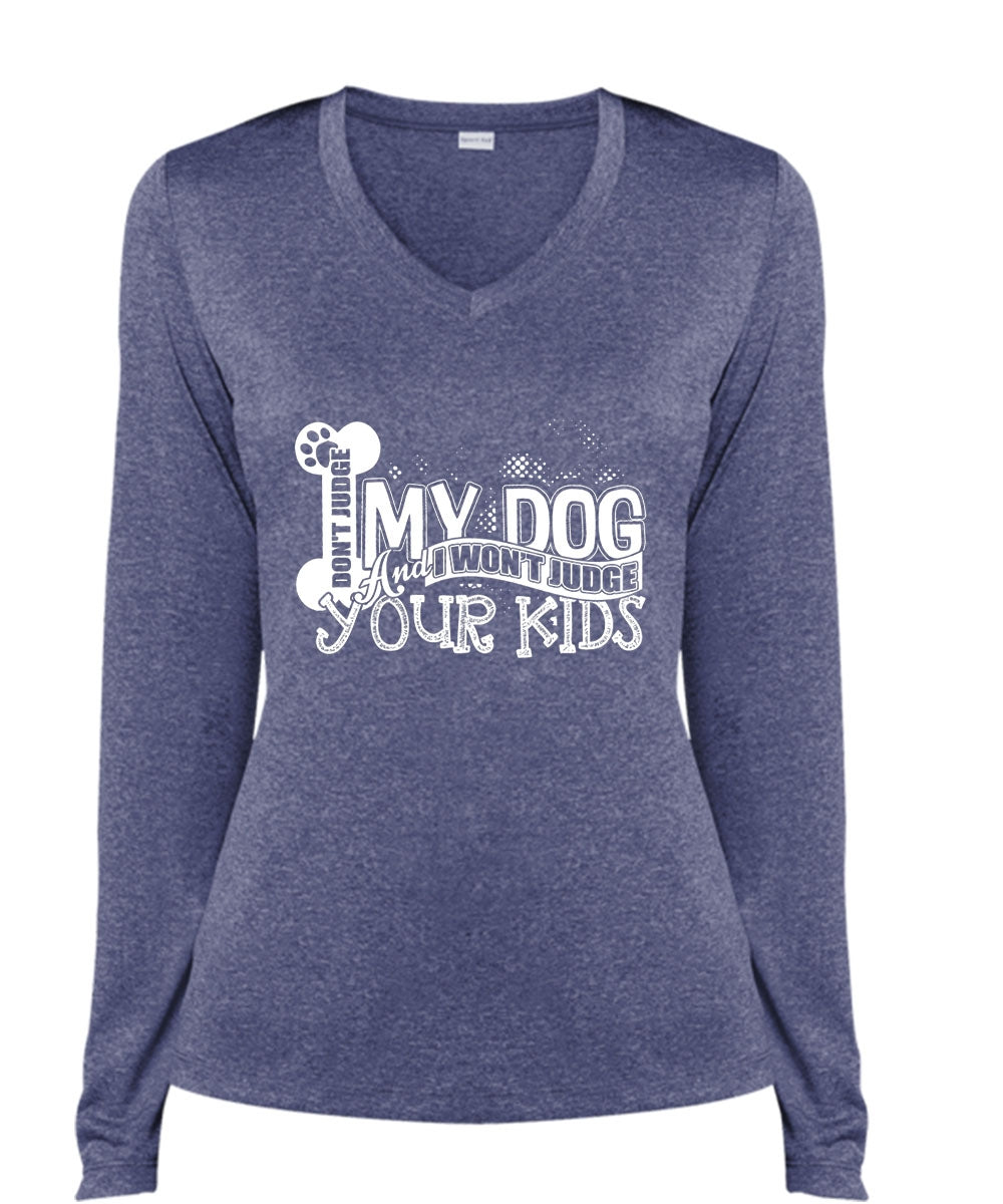 Don't Judge My Dog T Shirt, I Won't Judge Your Kids T Shirt, Cool Shirt (Ladies LS Heather V-Neck)