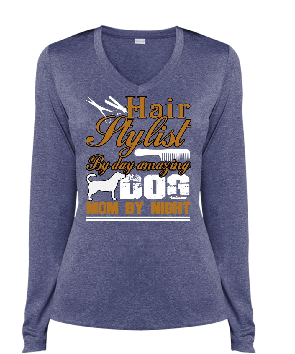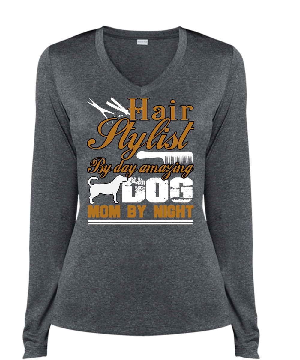 Hair Stylist By Day Amazing Dog T Shirt, Mom By Night T Shirt, Cool Shirt (Ladies LS Heather V-Neck)