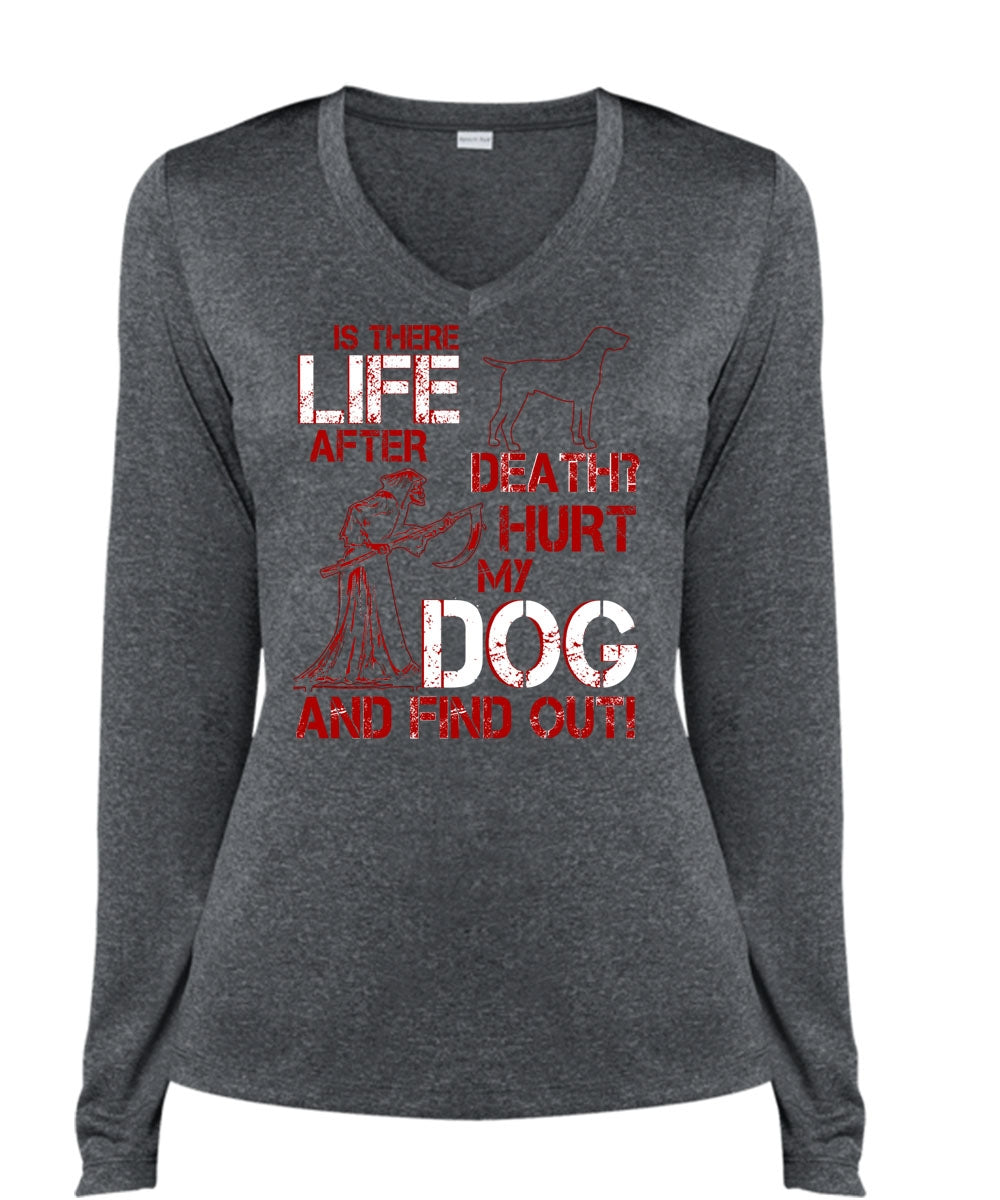 Hurt My Dog And Find Out T Shirt, Is There After Death T Shirt, Cool Shirt (Ladies LS Heather V-Neck)