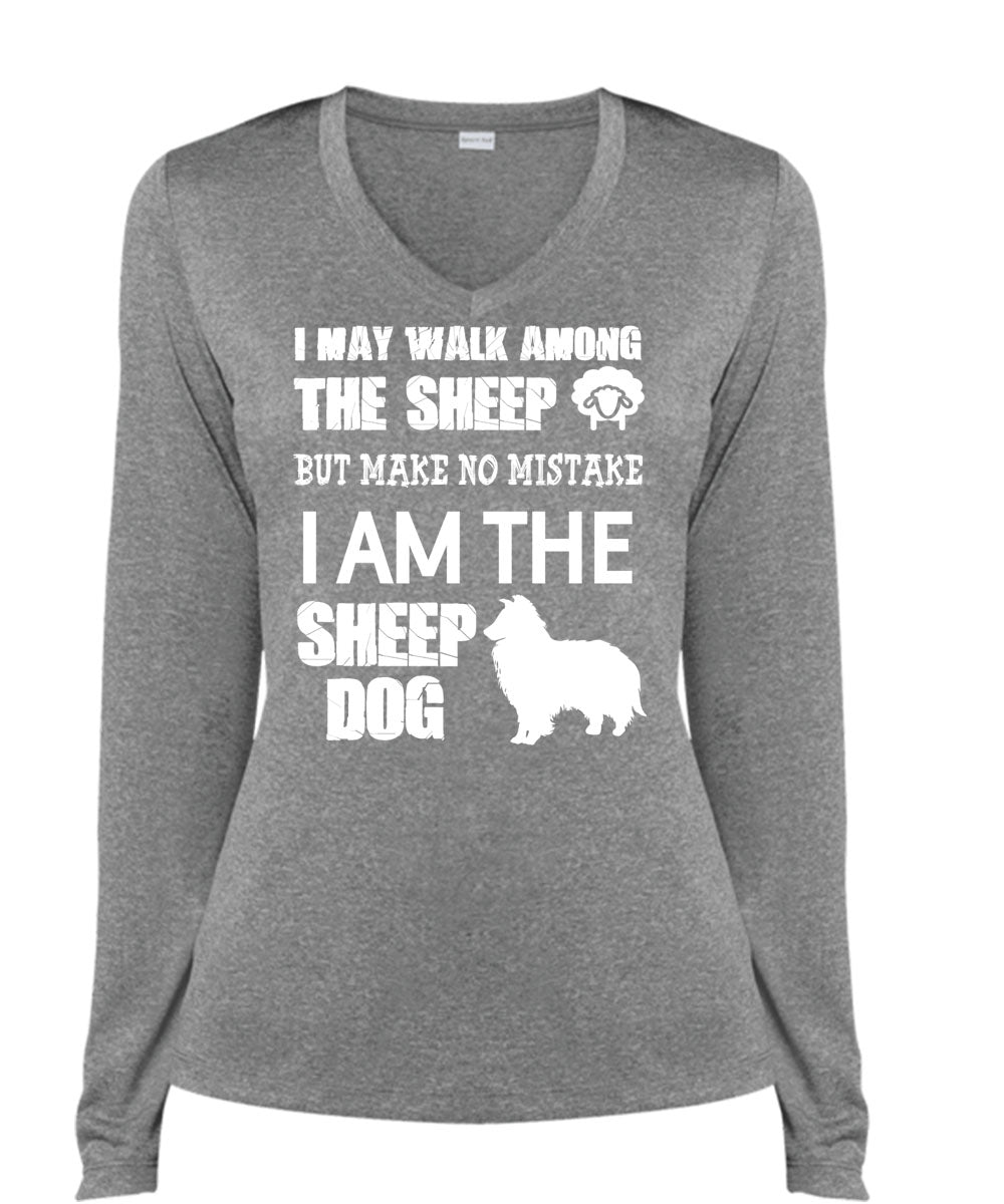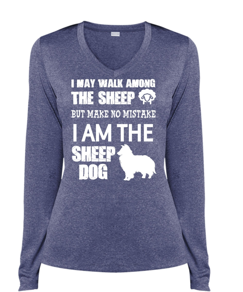I Am The Sheep Dog T Shirt, I May Walk Among The Sheep Shirt (Ladies LS Heather V-Neck)