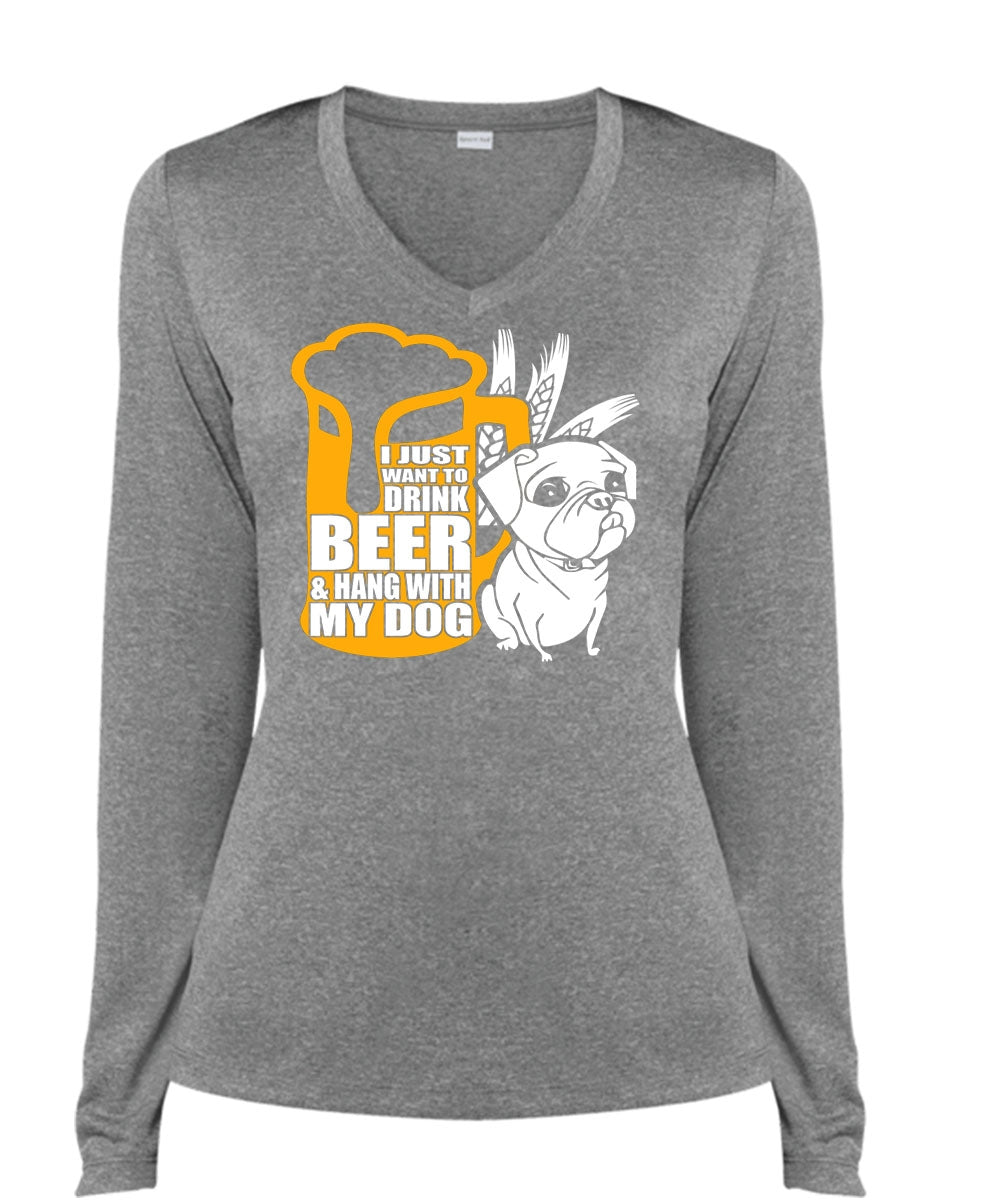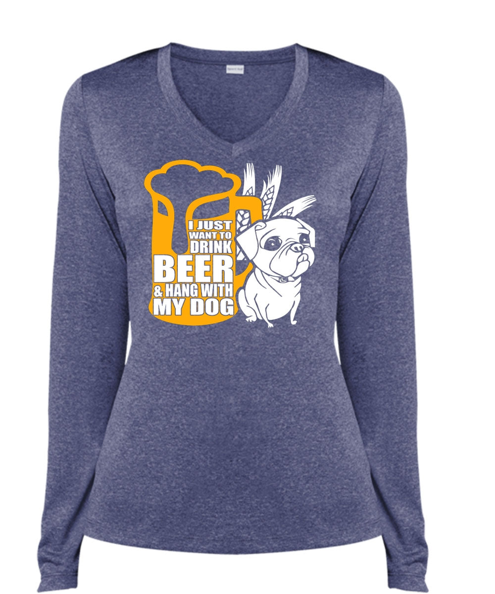 I Just Want To Drink Beer T Shirt, Hang With My Dog T Shirt, Cool Shirt (Ladies LS Heather V-Neck)