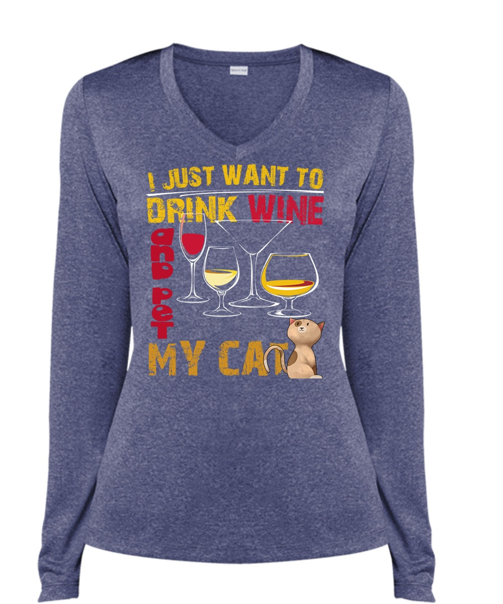 I Just Want To Drink Wine T Shirt, Pet My Cat T Shirt, Cool Shirt (Ladies LS Heather V-Neck)