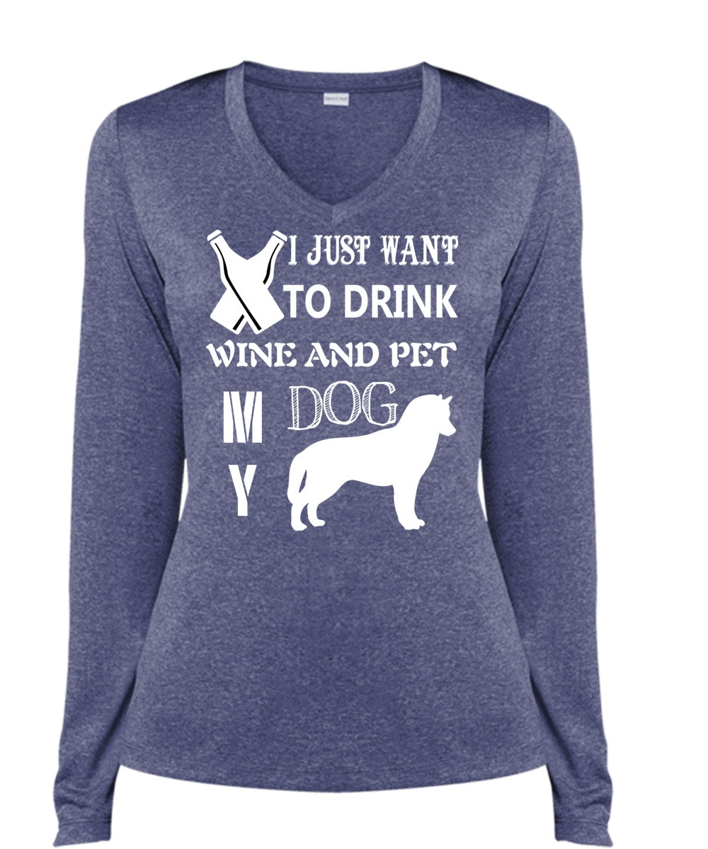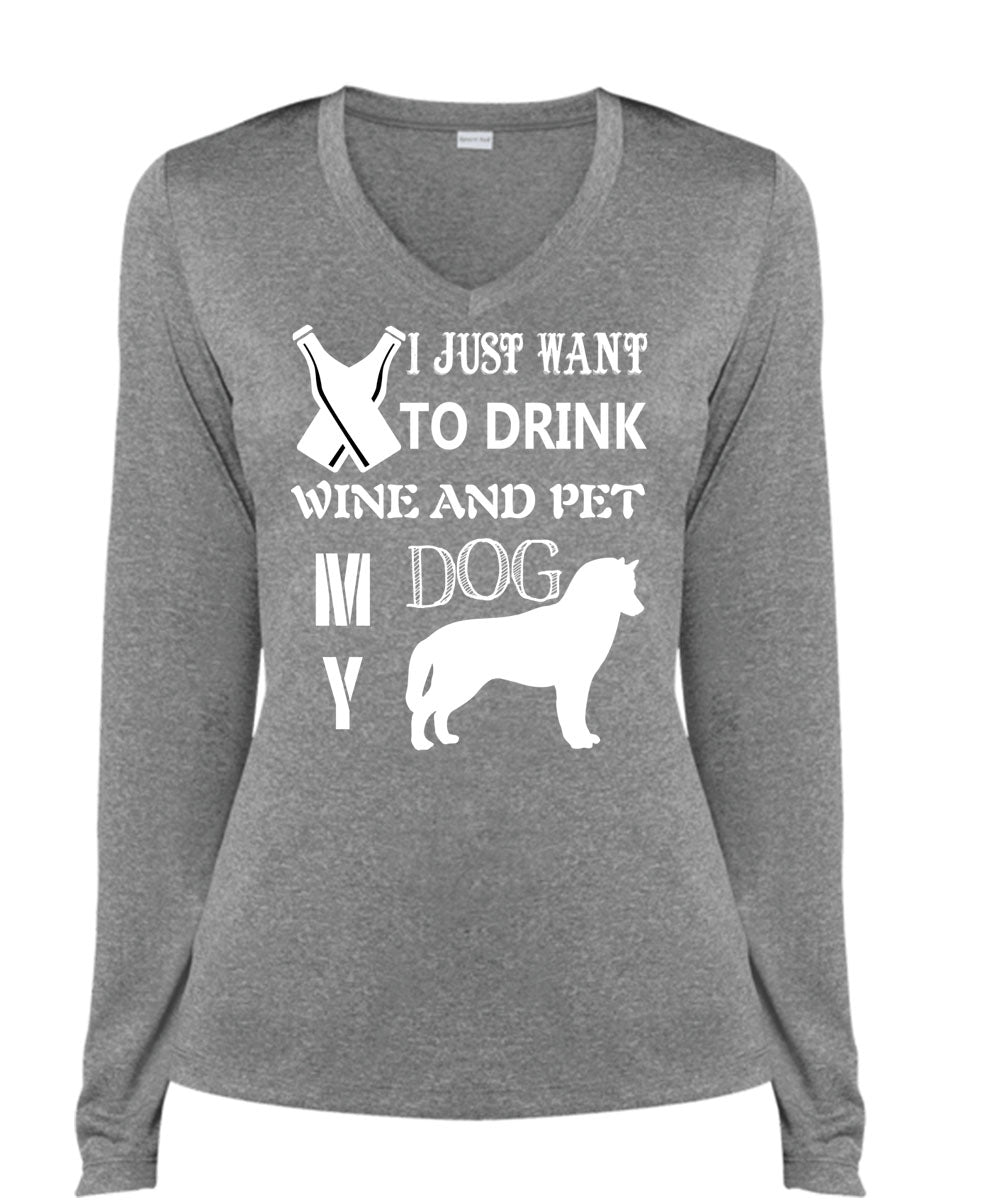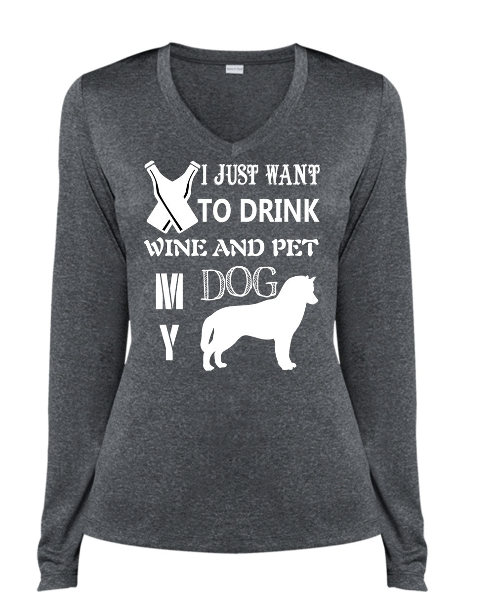 I Just Want To Drink Wine T Shirt, Pet My Dog Shirt (Ladies LS Heather V-Neck)