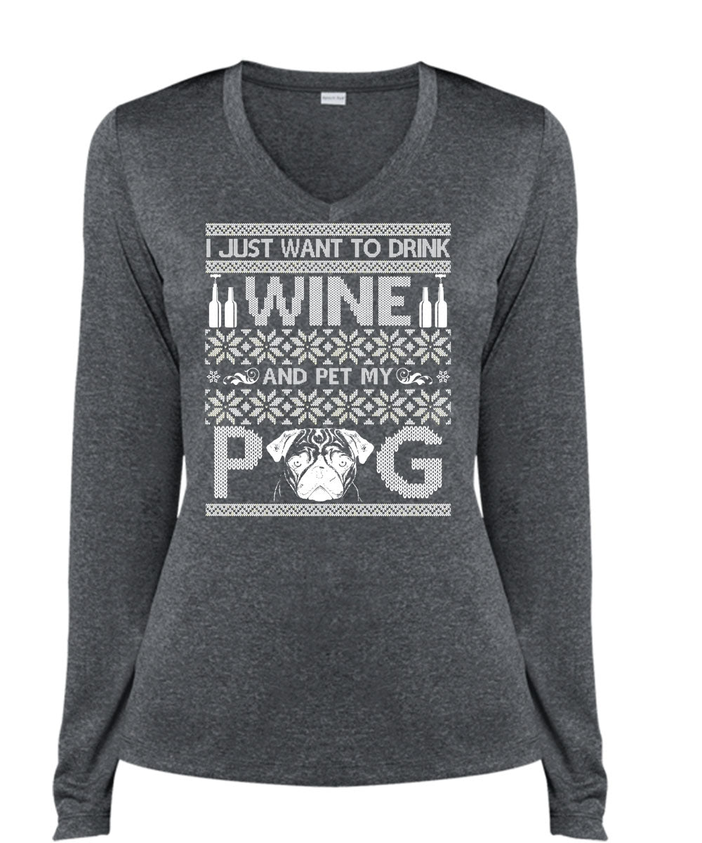 I Just Want To Drink Wine T Shirt, Pet My Dog T Shirt, Cool Shirt (Ladies LS Heather V-Neck)