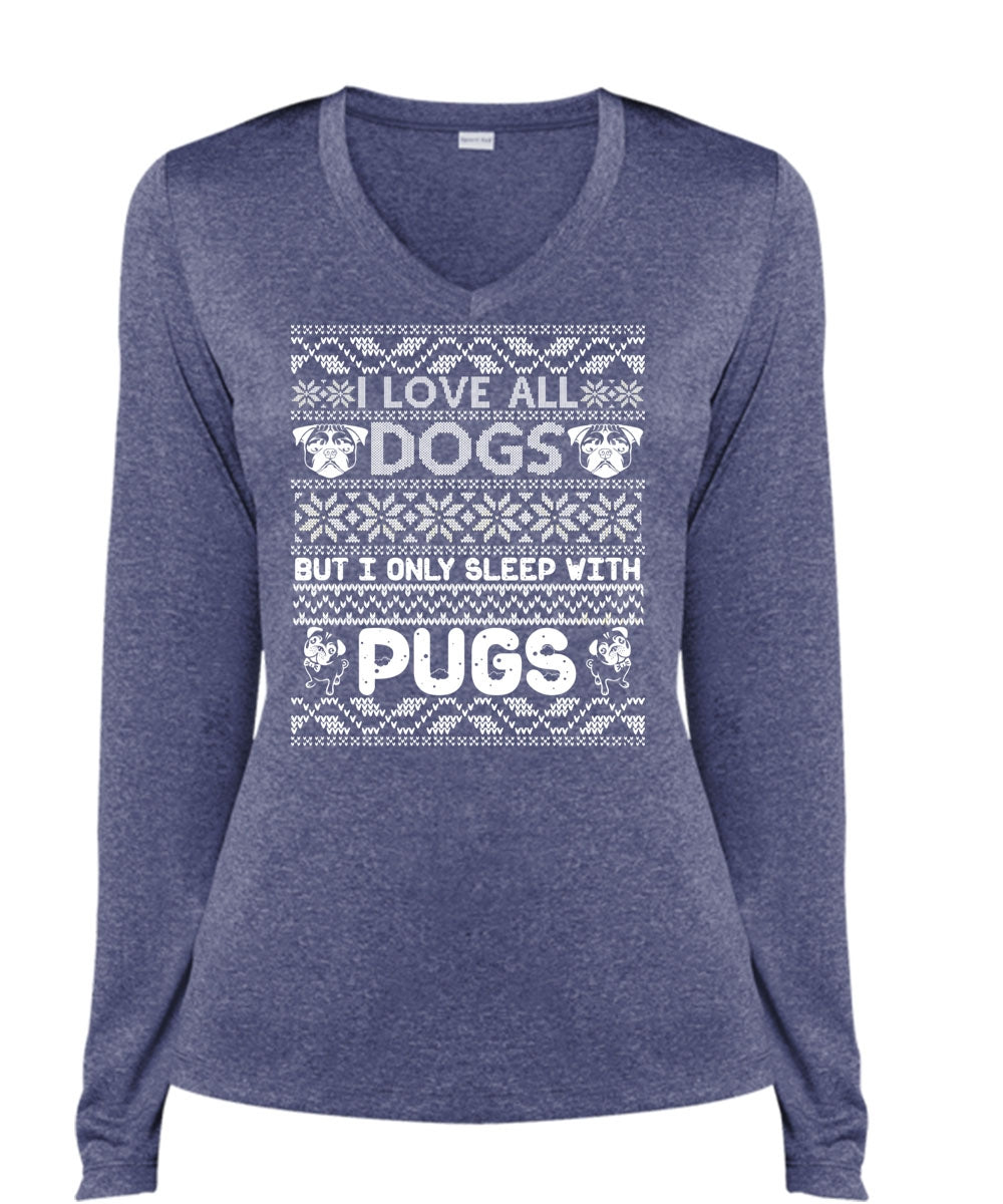 I Love All Dogs T Shirt, I Only Sleep With Pugs T Shirt, Cool Shirt (Ladies LS Heather V-Neck)