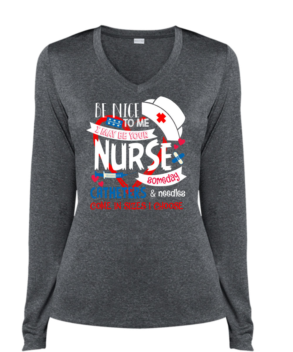 I May Be Your Nurse Someday Catheters T Shirt, I Love Nursing T Shirt, Cool Shirt (Ladies LS Heather V-Neck)