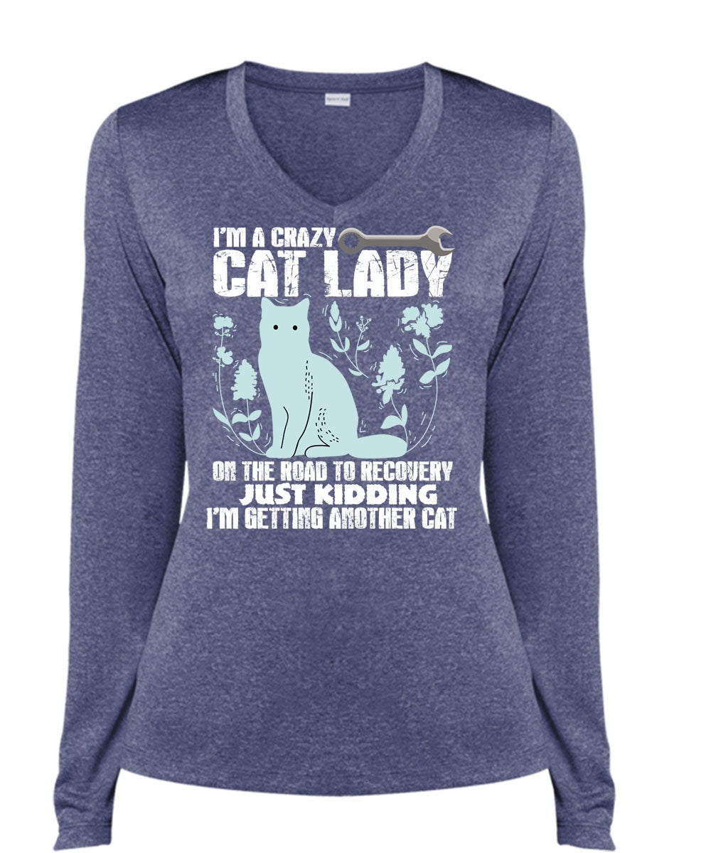 I'm A Crazy Cat Lady On The Road T Shirt, I'm Getting Another Cat T Shirt, Cool Shirt (Ladies LS Heather V-Neck)