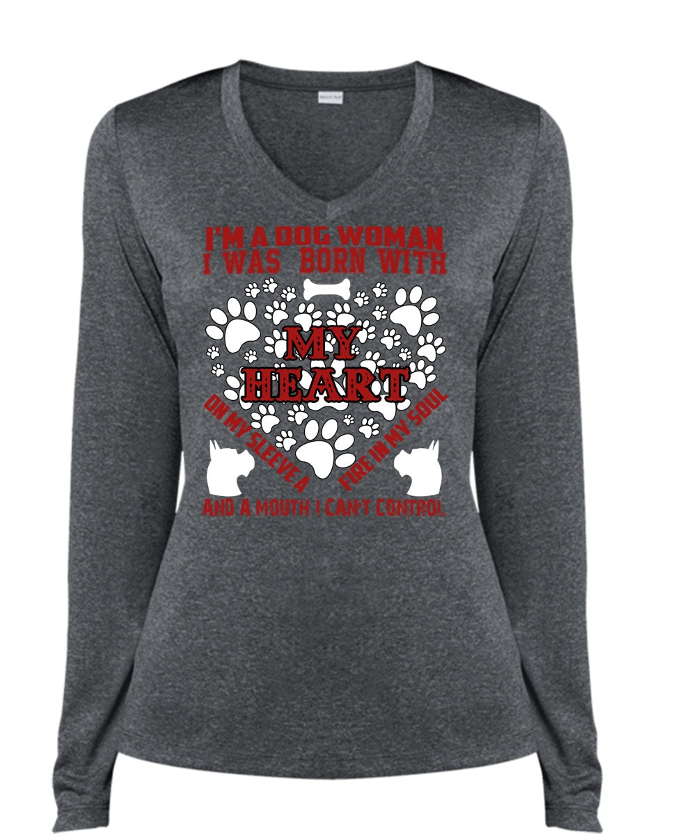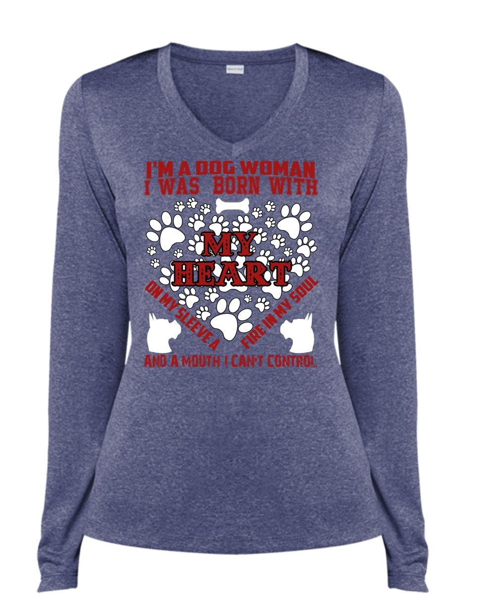 I'm A Dog Woman T Shirt, I Was Born With My Heart T Shirt, Cool Shirt (Ladies LS Heather V-Neck)