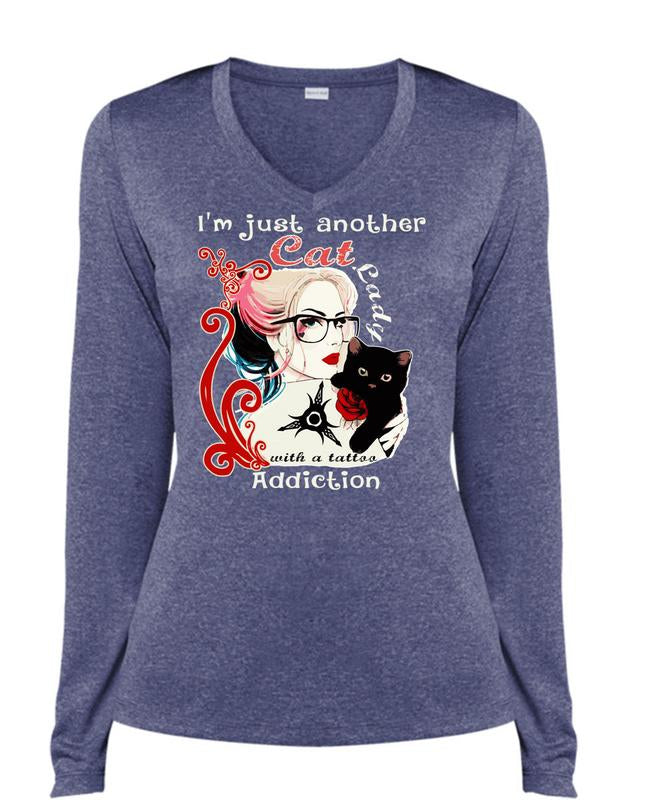 I'm Just Another Cat Lady T Shirt, Tattoo Addiction T Shirt, Cool Shirt (Ladies LS Heather V-Neck)