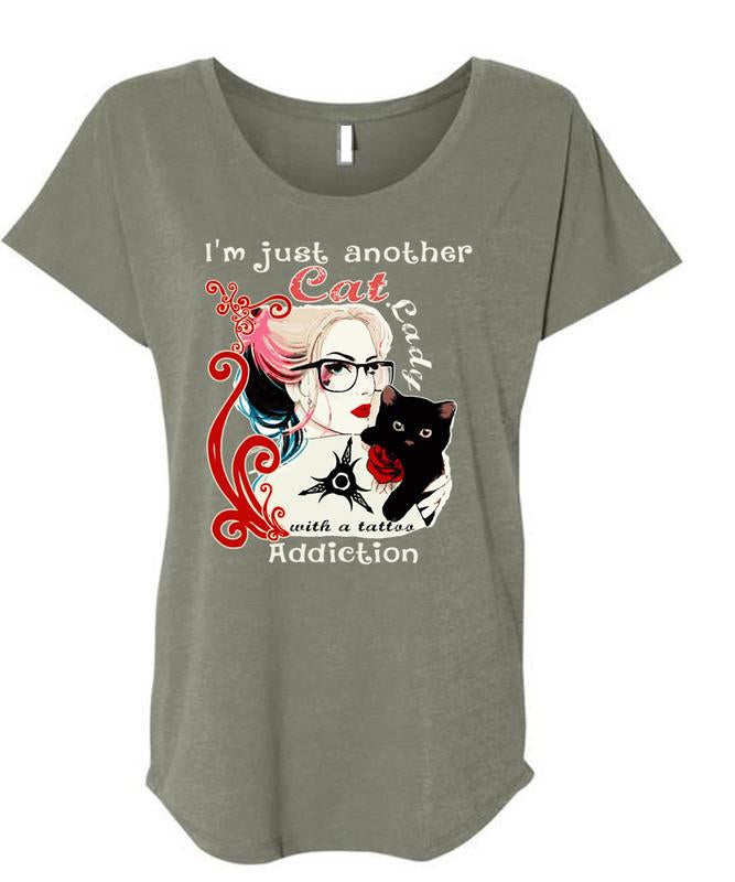 I'm Just Another Cat Lady T Shirt, Tattoo Addiction T Shirt, Cool Shirt (Ladies' Triblend Dolman Sleeve)