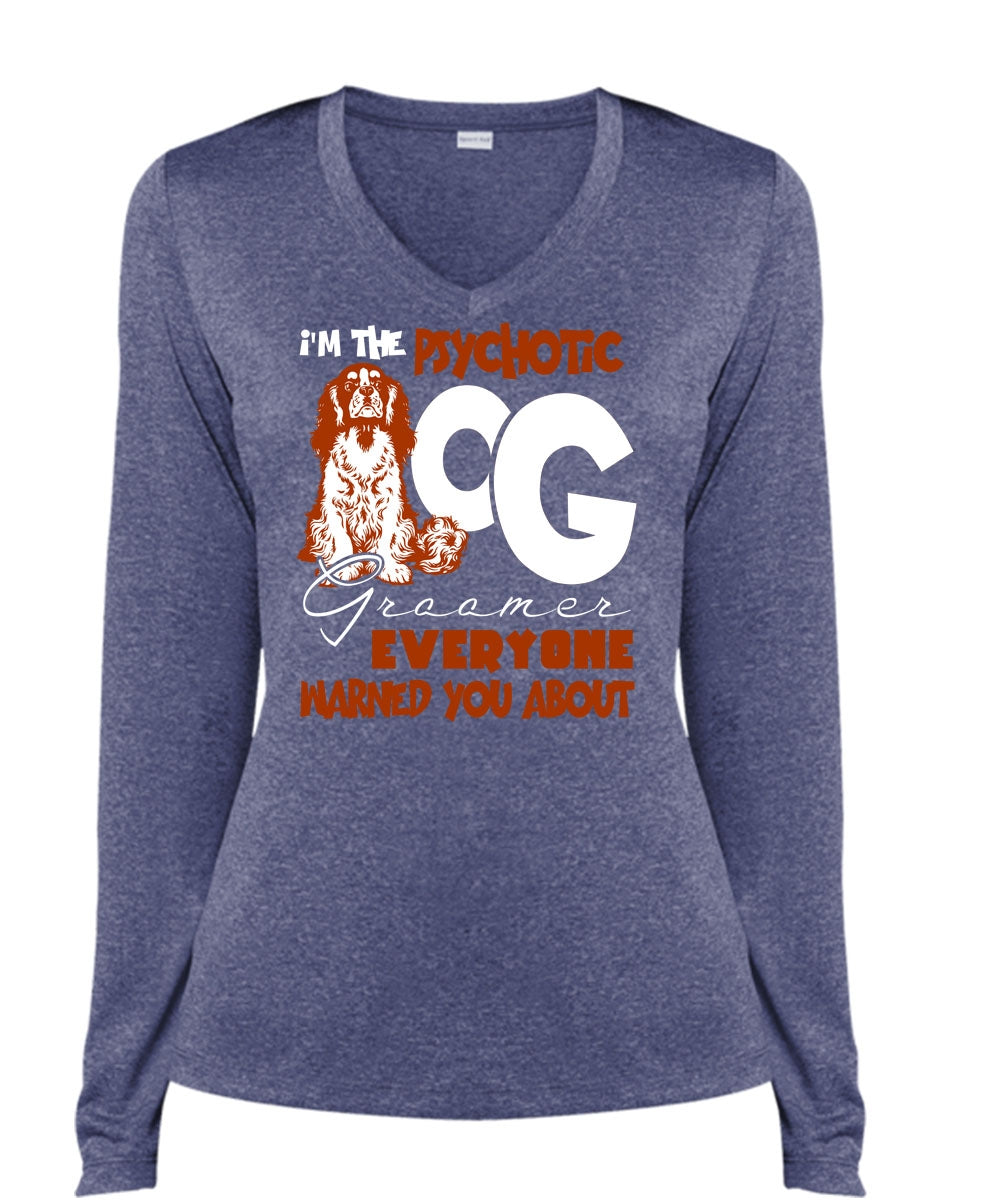 I'm The Psychotic Dog Groomer T Shirt, My Favorite T Shirt, Cool Shirt (Ladies LS Heather V-Neck)