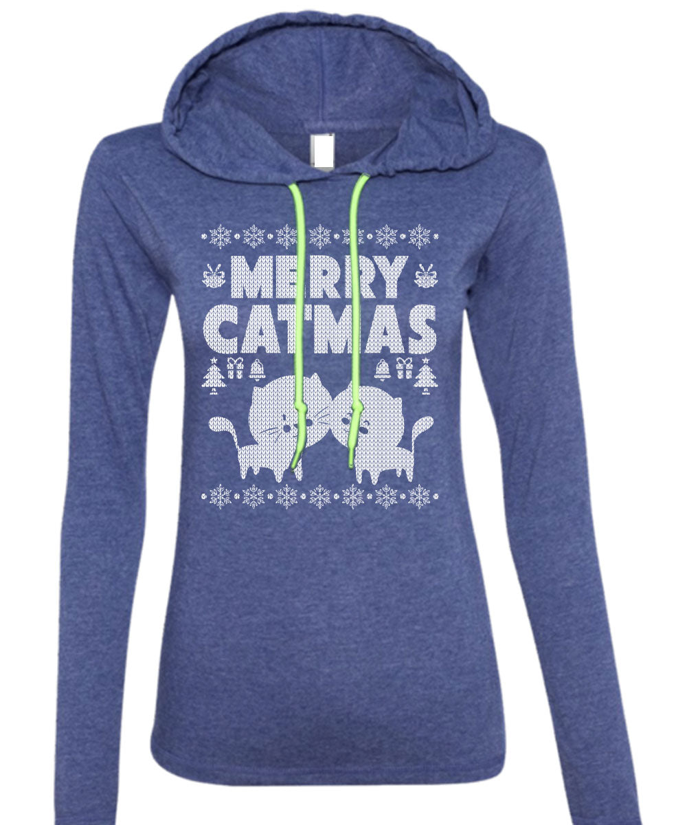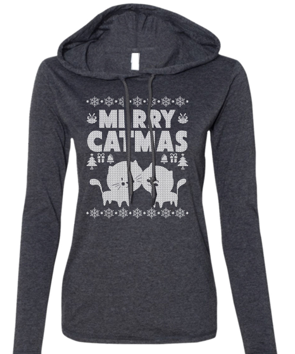 Merry Catmas T Shirt, Funny Winter T Shirt (Anvil Ladies Ringspun Hooded)