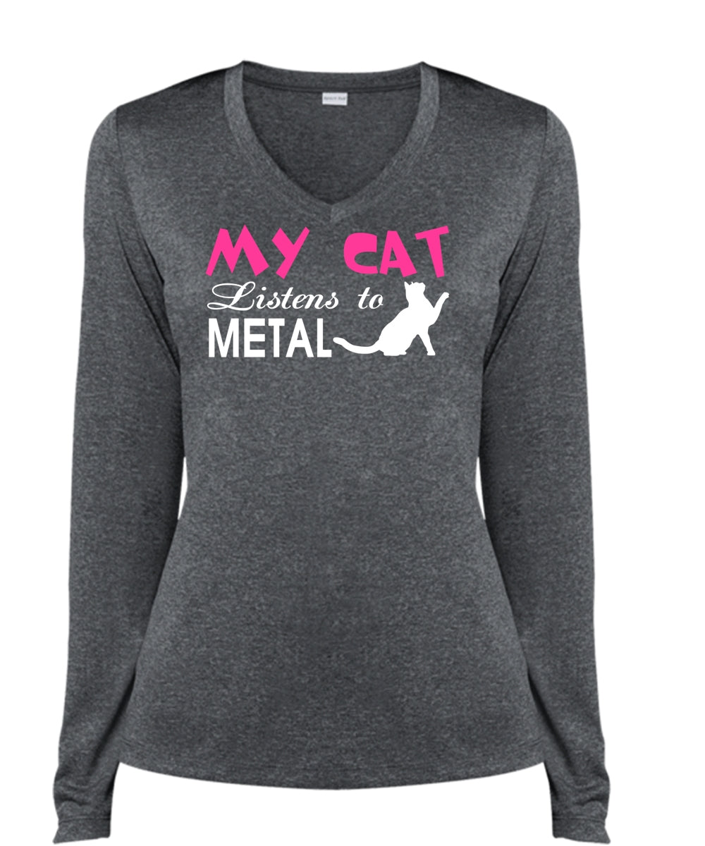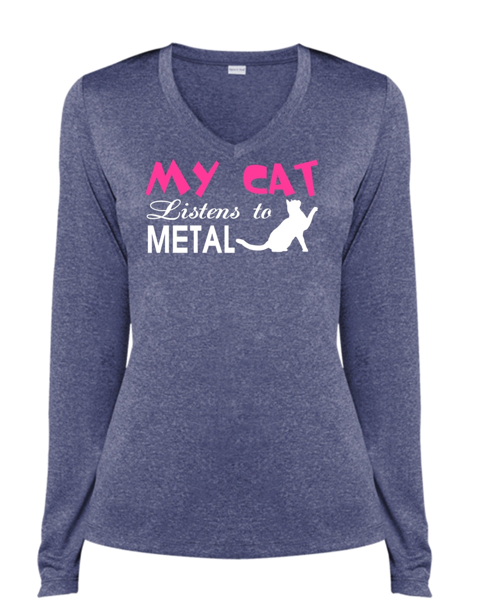 My Cat Listens To Metal T Shirt, My Pets T Shirt, I Love My Cat T Shirt (Ladies LS Heather V-Neck)