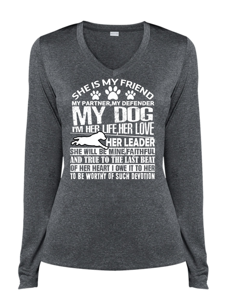 My Defender My Dog T Shirt, I'm Her Life Her Love T Shirt, Cool Shirt (Ladies LS Heather V-Neck)