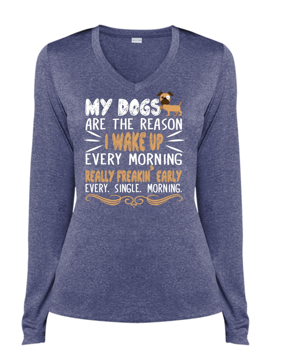 My Dogs Are The Reason T Shirt, I Wake Up Every Morning Really Freaking Early T Shirt (Ladies LS Heather V-Neck)