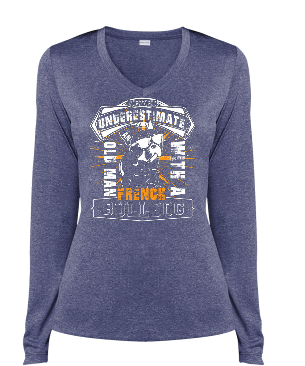 Never Underestimate An Old Man With A French Bulldog T Shirt, I Love My Dogs T Shirt, Cool Shirt (Ladies LS Heather V-Neck)