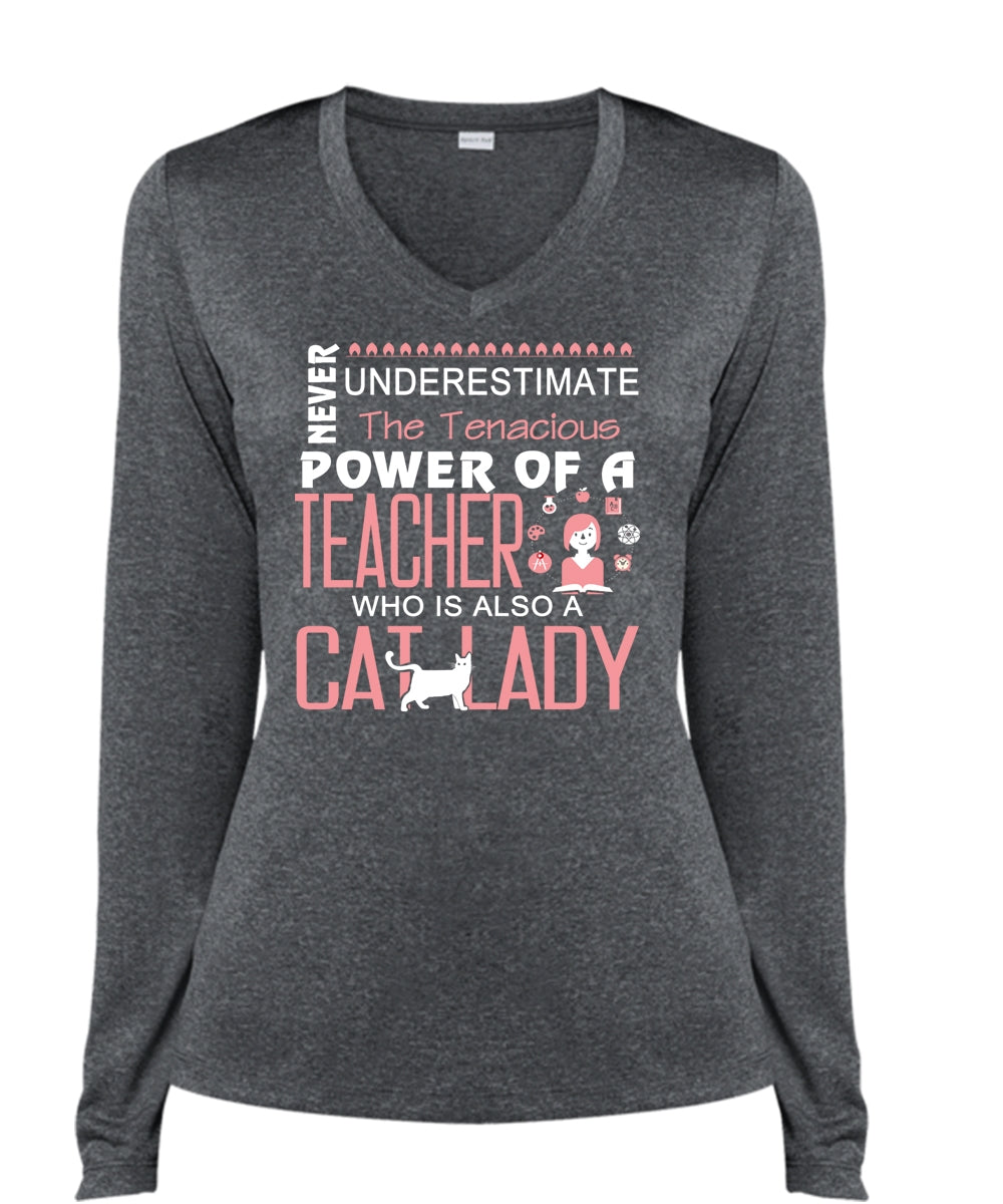 Never Underestimate The Tenacious Power Of A Teacher T Shirt, Cat Lady T Shirt (Ladies LS Heather V-Neck)