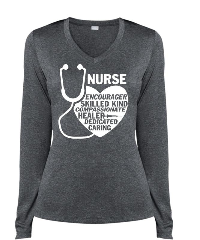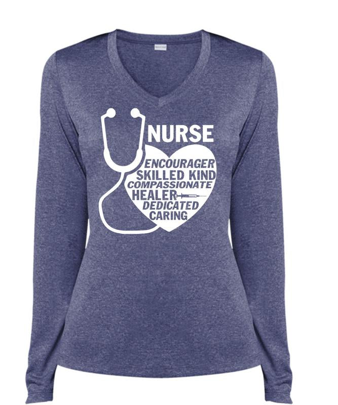 Nurse Encourager Skilled Kind T Shirt, Healer Dedicated Caring T Shirt, Cool Shirt (Ladies LS Heather V-Neck)