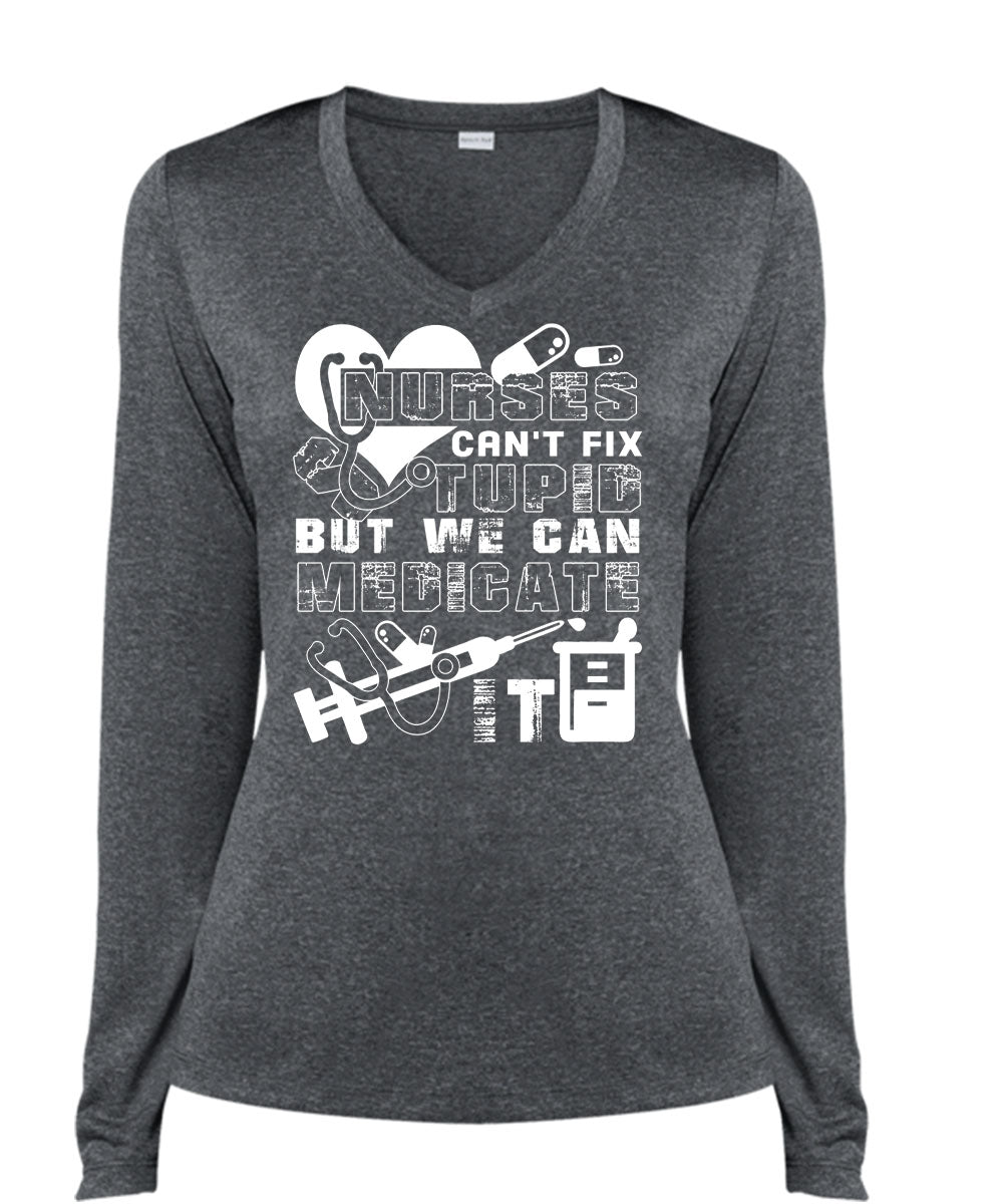 Nurses Can't Fix Stupid T Shirt, We Can Medicate It T Shirt, Cool Shirt (Ladies LS Heather V-Neck)