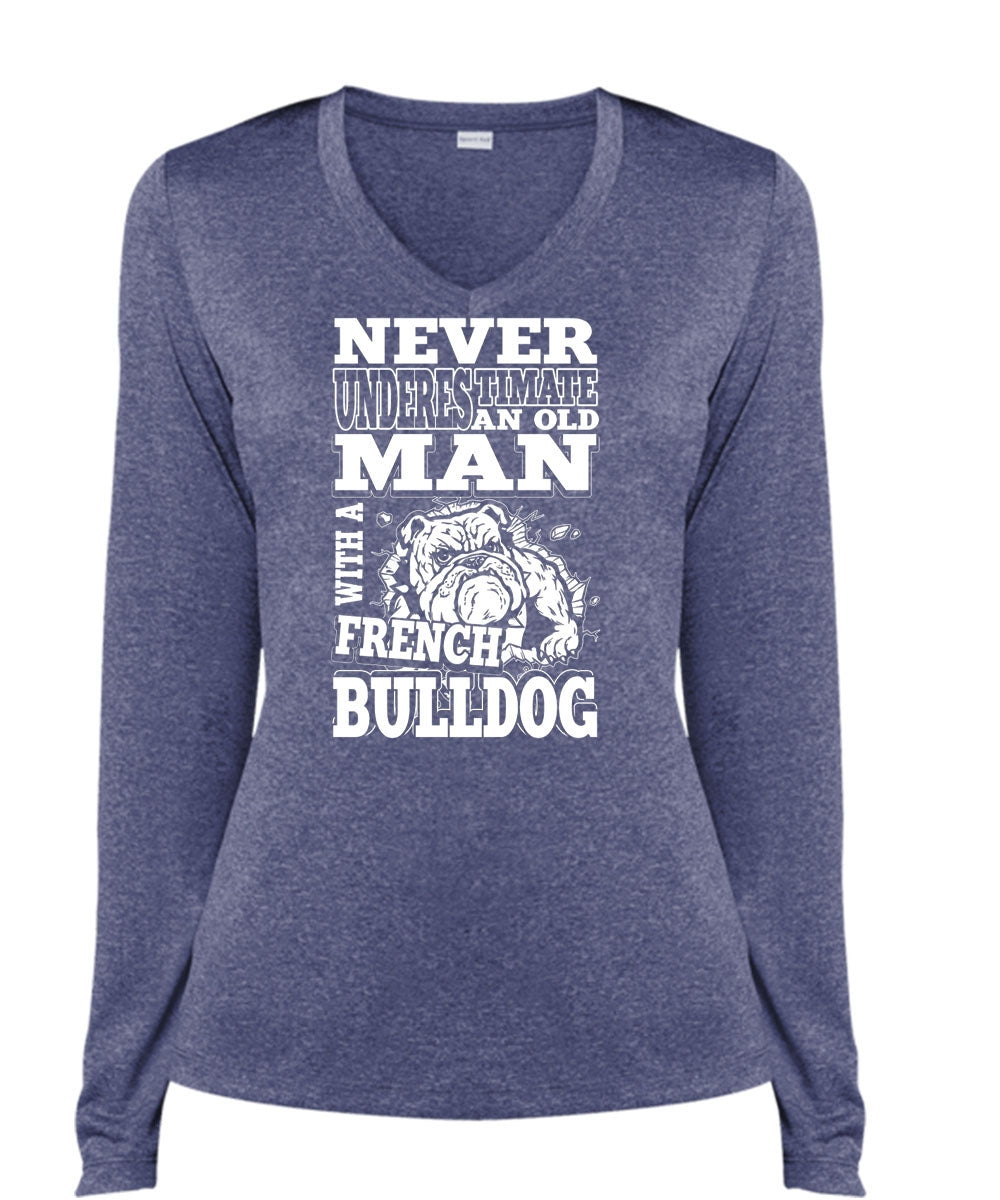 Old Man With A French Bulldog T Shirt, My Favorite T Shirt, Cool Shirt (Ladies LS Heather V-Neck)