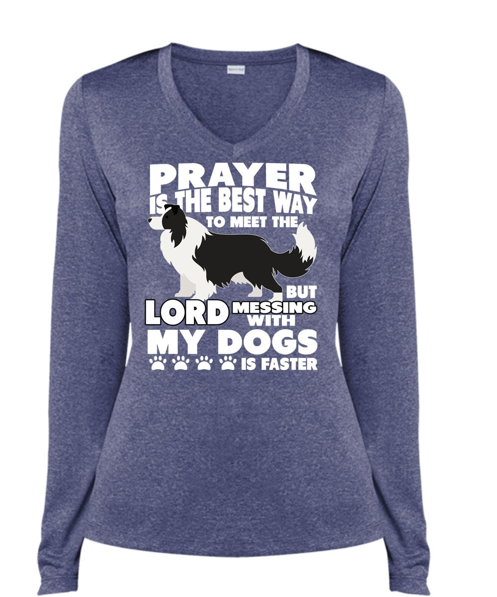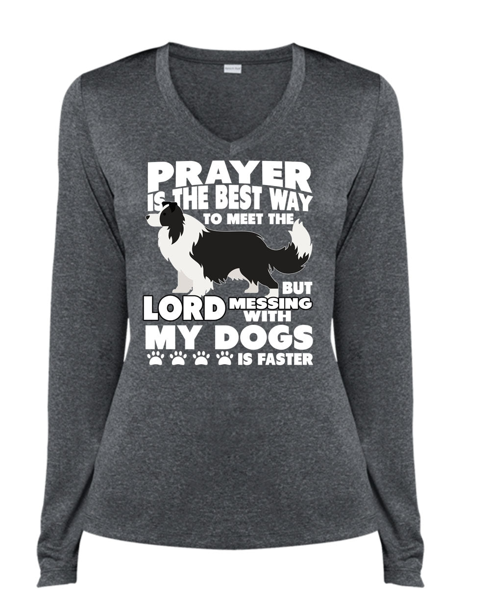 Prayer Is The Best Way T Shirt, Messing With My Dogs T Shirt, Cool Shirt (Ladies LS Heather V-Neck)