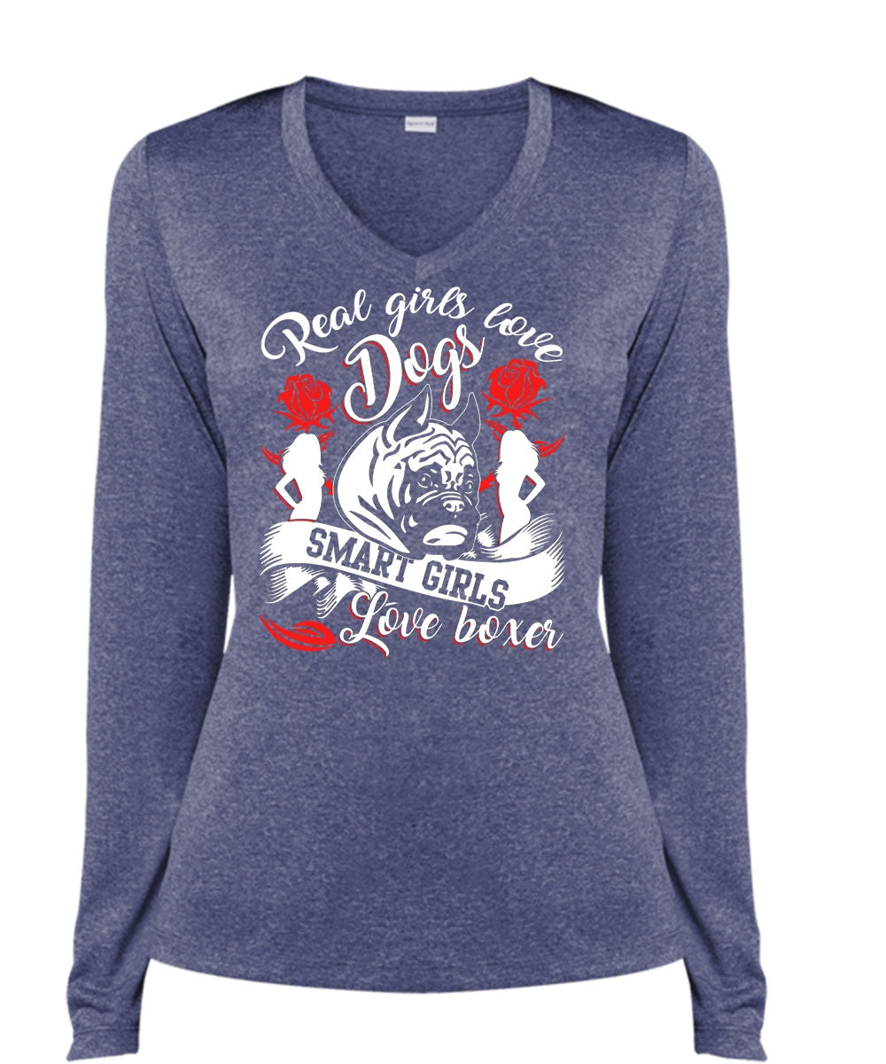 Real Girls Love Dogs T Shirt, Smart Girls Love Boxer T Shirt, Cool Shirt (Ladies LS Heather V-Neck)