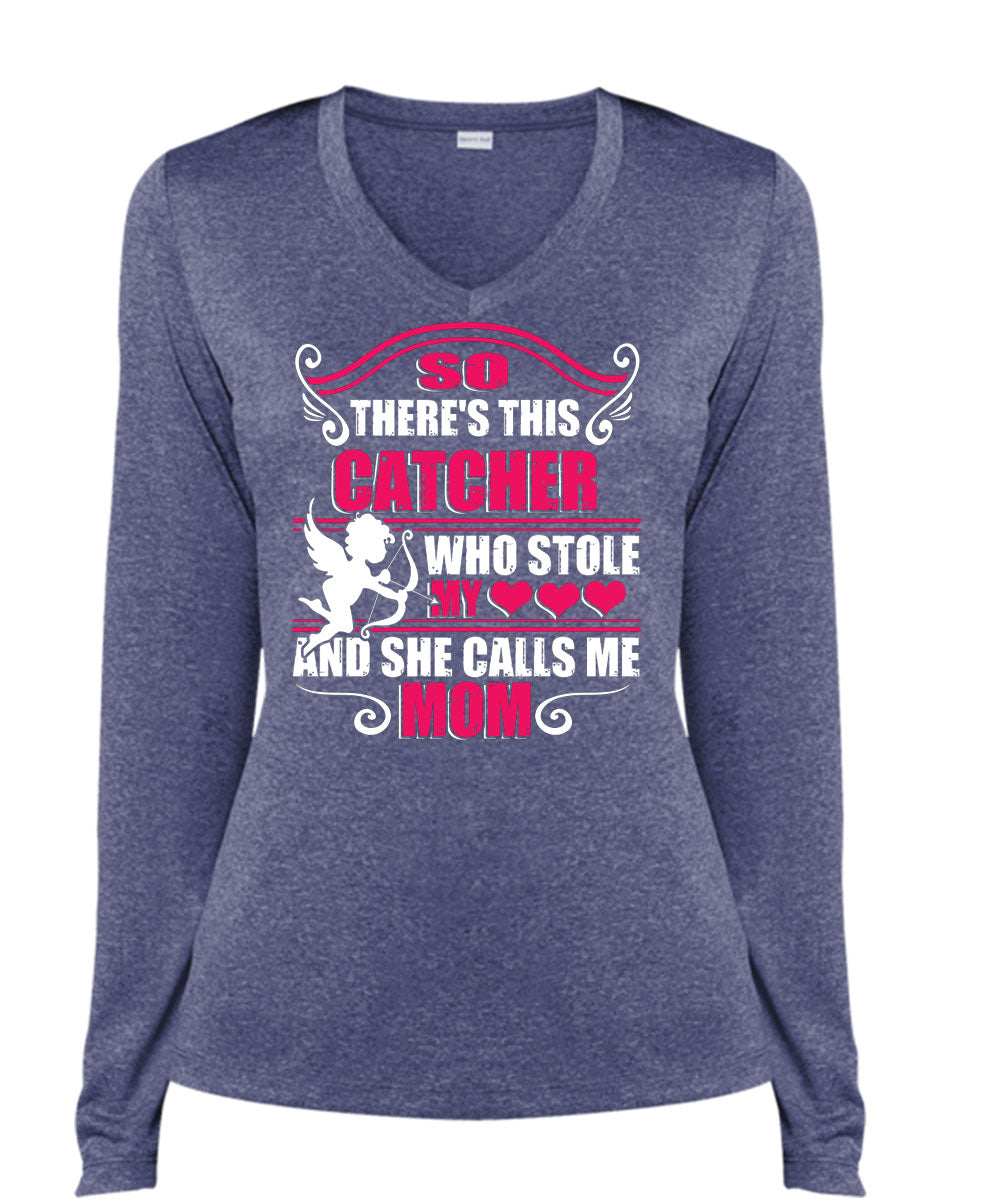 So There's This Catcher Who Stole My Heart T Shirt, She Calls Me Mom T Shirt, Cool Shirt (Ladies LS Heather V-Neck)