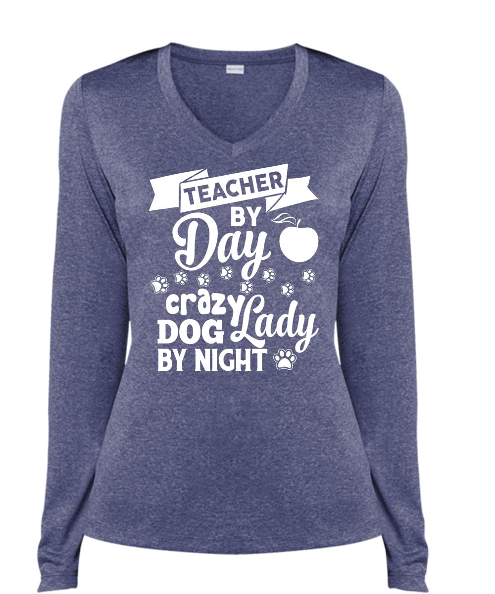 Teacher By Dad Crazy Dog Lady By Night T Shirt, Job T Shirt (Ladies LS Heather V-Neck)
