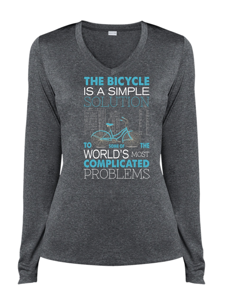 The Bicycle Is A Simple Solution T Shirt, The World's Most Complicated Problems T Shirt (Ladies LS Heather V-Neck)