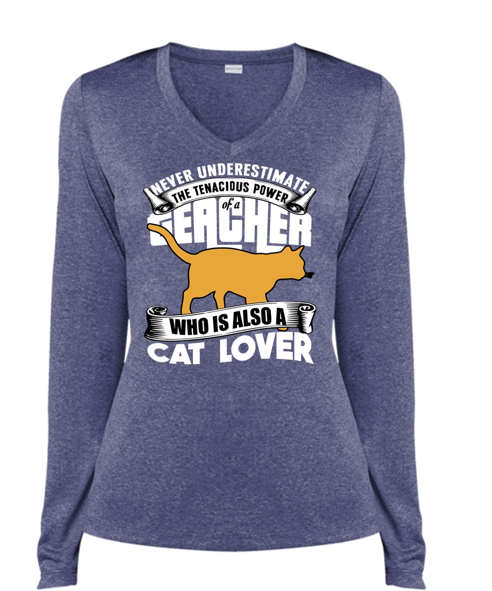 The Tenacious Power Of A Teacher T Shirt, Cat Lover T Shirt, Cool Shirt (Ladies LS Heather V-Neck)