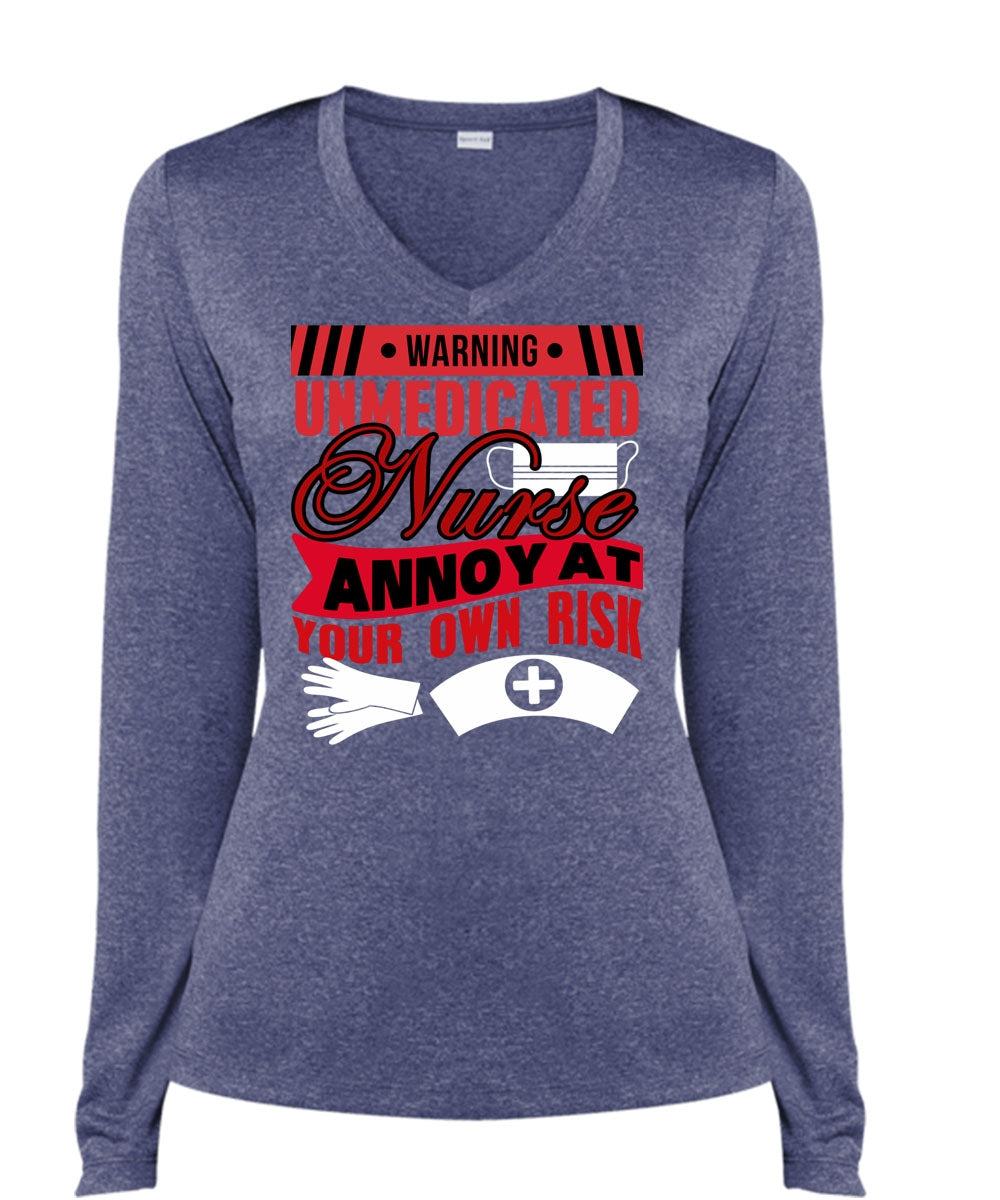 Warning Unmedicated Nurse T Shirt, Being A Nurse T Shirt, Cool Shirt (Ladies LS Heather V-Neck)