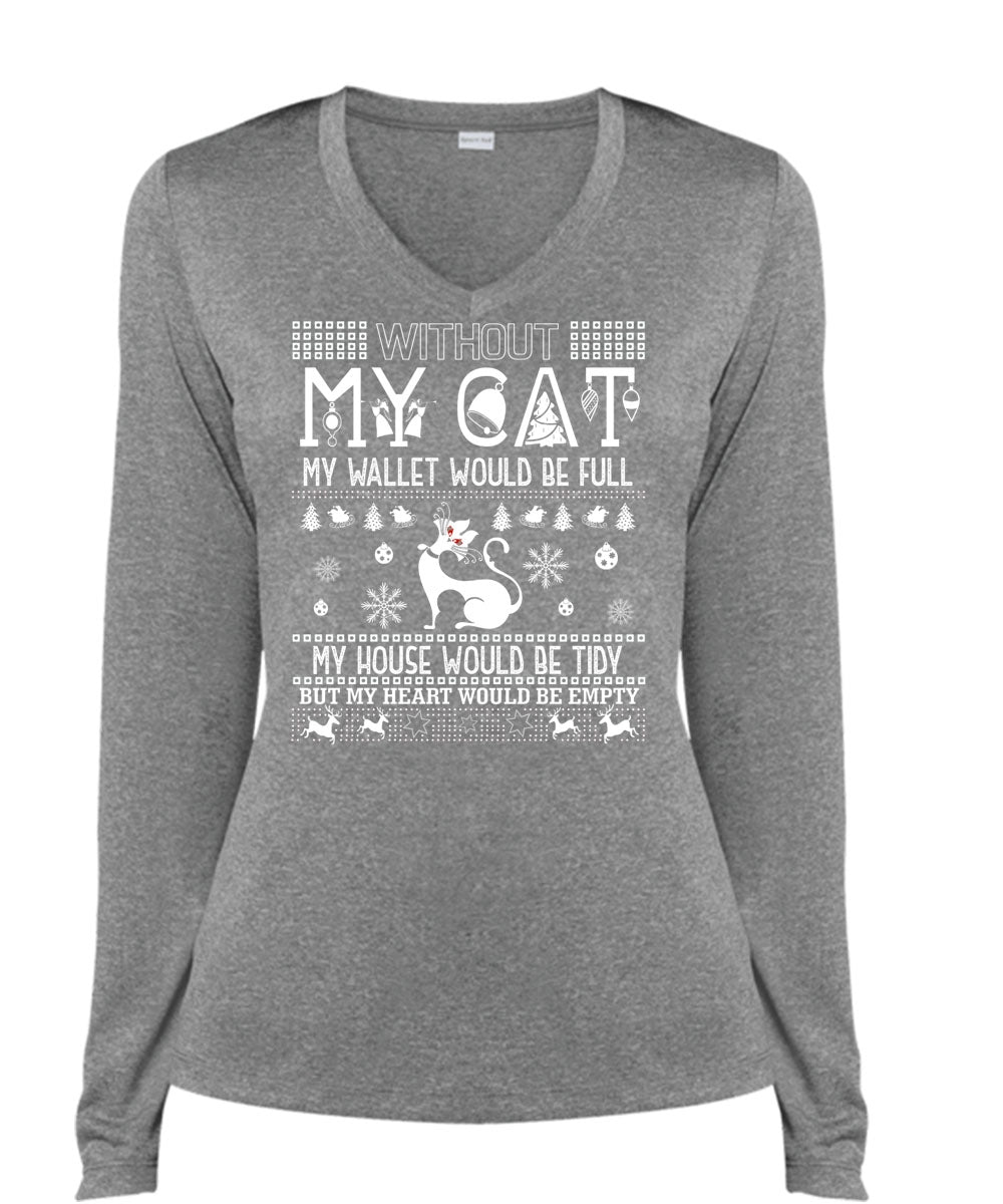 Without My Cat My Wallet Would Be Full T Shirt, My Heart Would Be Empty T Shirt, Cool Shirt (Ladies LS Heather V-Neck)