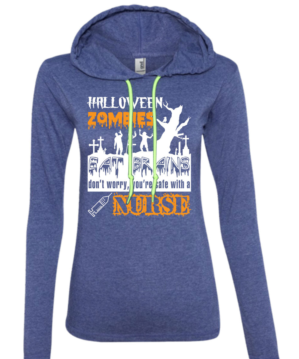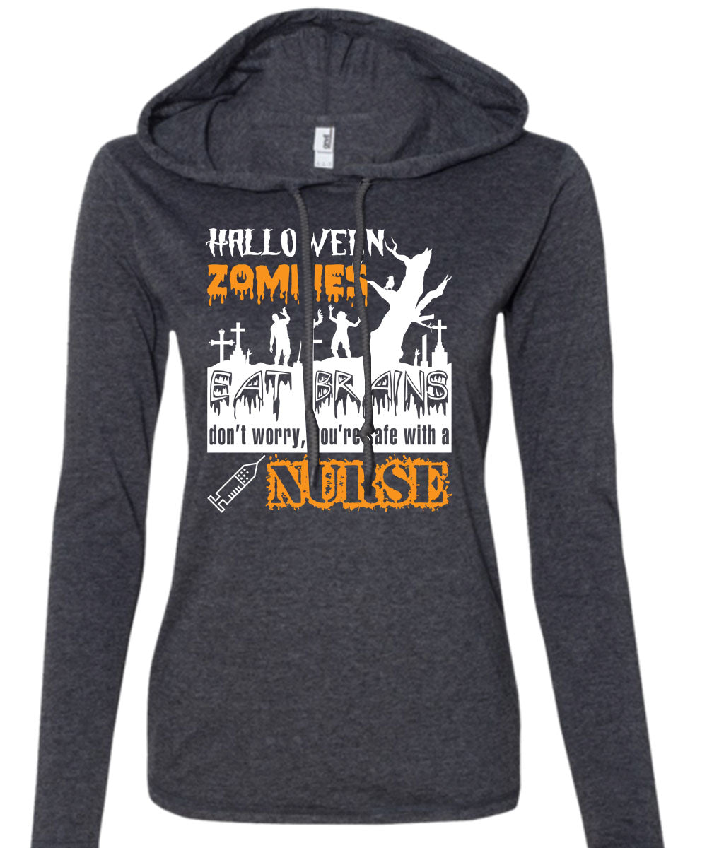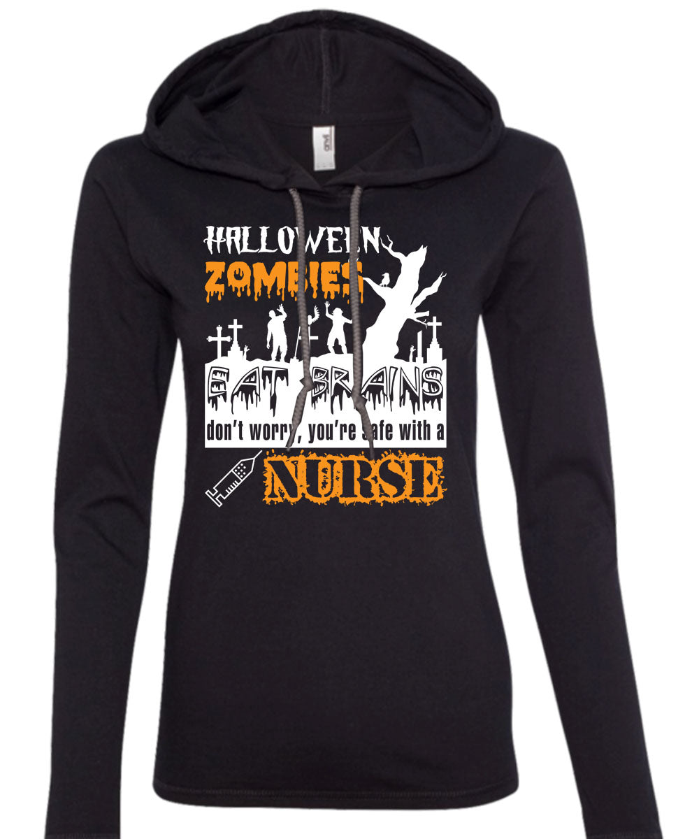 Halloween Zombies Eat Brains T Shirt, You're Safe With A Nurse T Shirt (Anvil Ladies Ringspun Hooded)