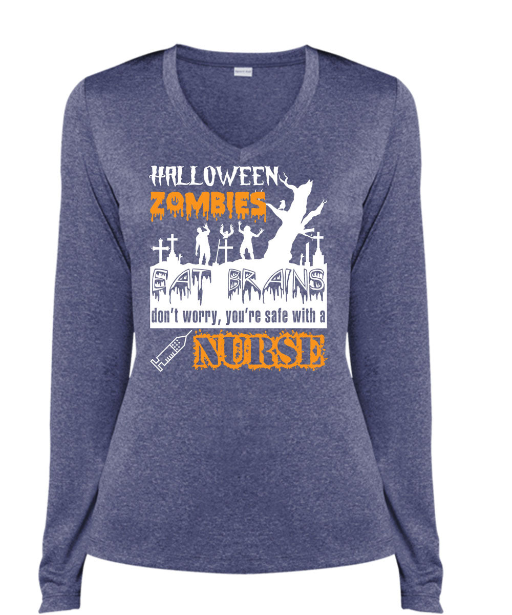 Halloween Zombies Eat Brains T Shirt, You're Safe With A Nurse T Shirt, Cool Shirt (Ladies LS Heather V-Neck)