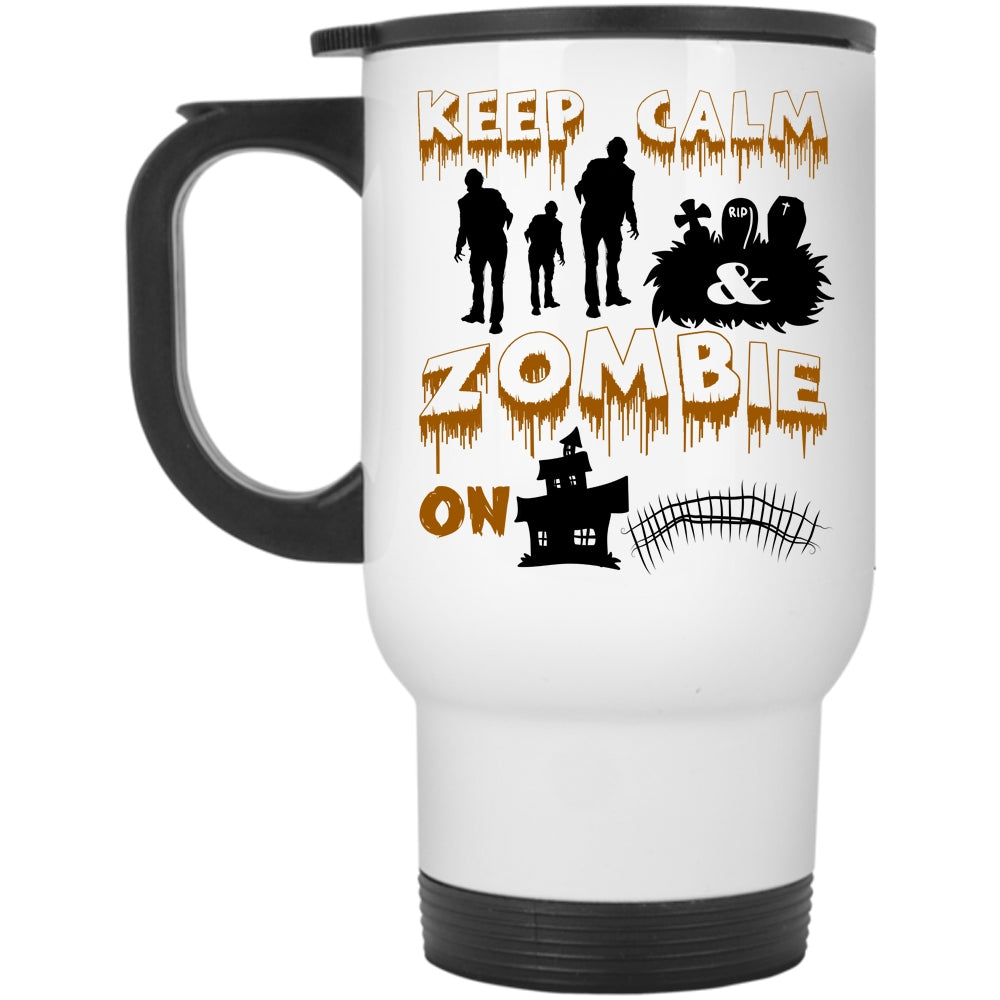 Scary Halloween Travel Mug, Keep Calm And Zombie On Mug