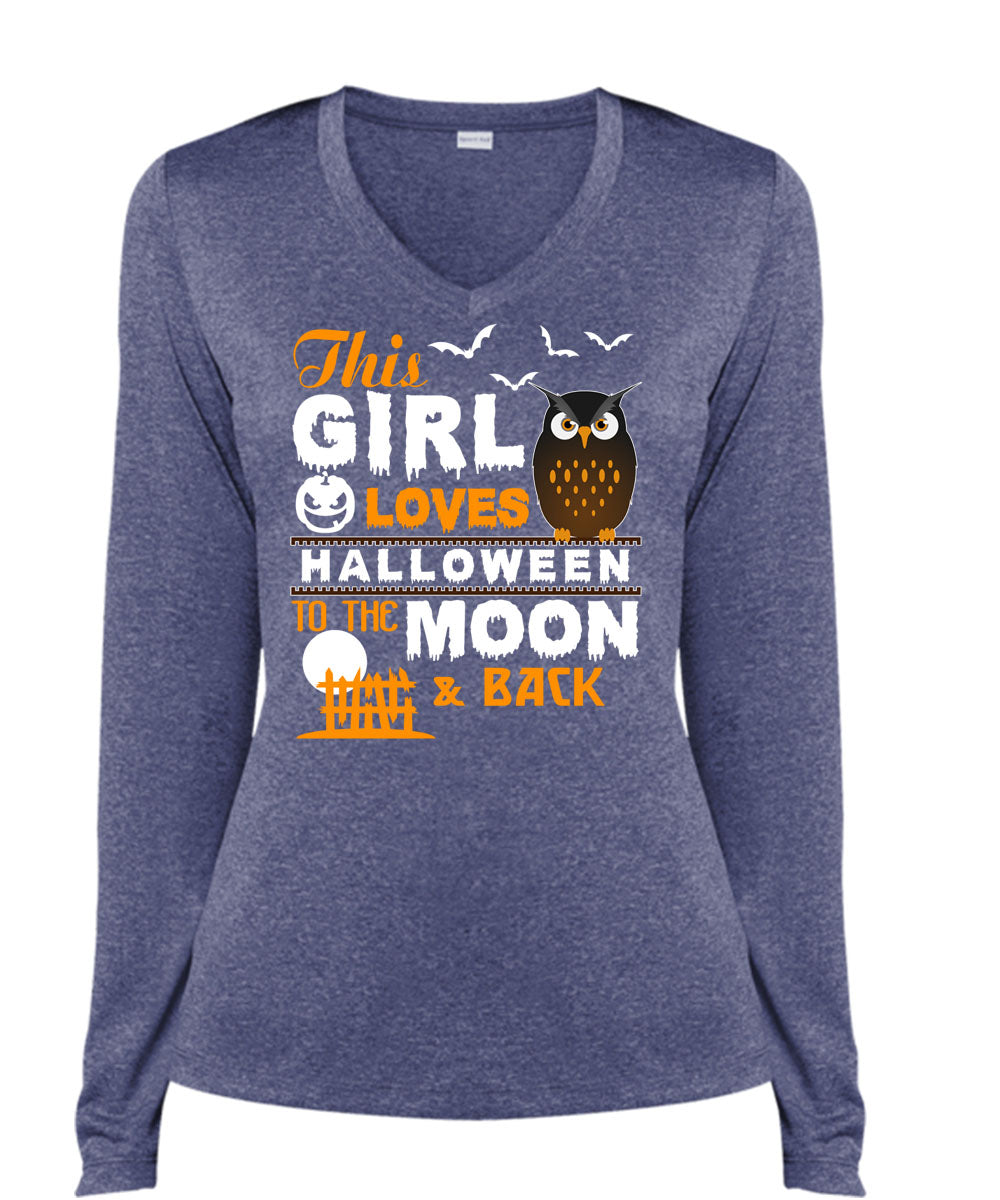 This Girl Loves Halloween To The Moon And Back T Shirt, I Love You Pumpkin T Shirt, Cool Shirt (Ladies LS Heather V-Neck)