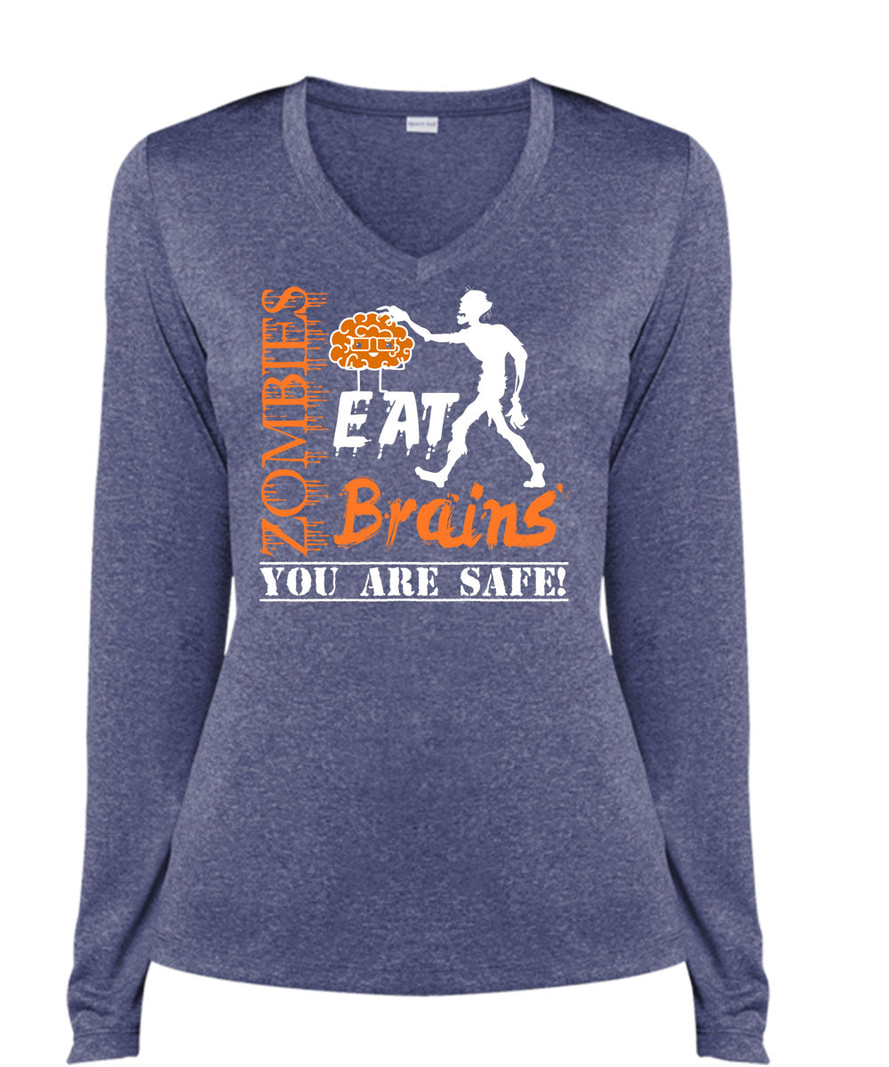 Zombies Eat Brains You Are Safe T Shirt, Wait For Halloween T Shirt, Cool Shirt (Ladies LS Heather V-Neck)