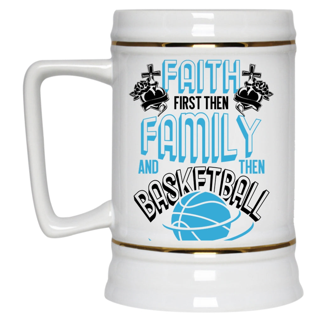 Cool Basketball Beer Stein 22oz, Faith First Then Family And Then Basketball Beer Mug
