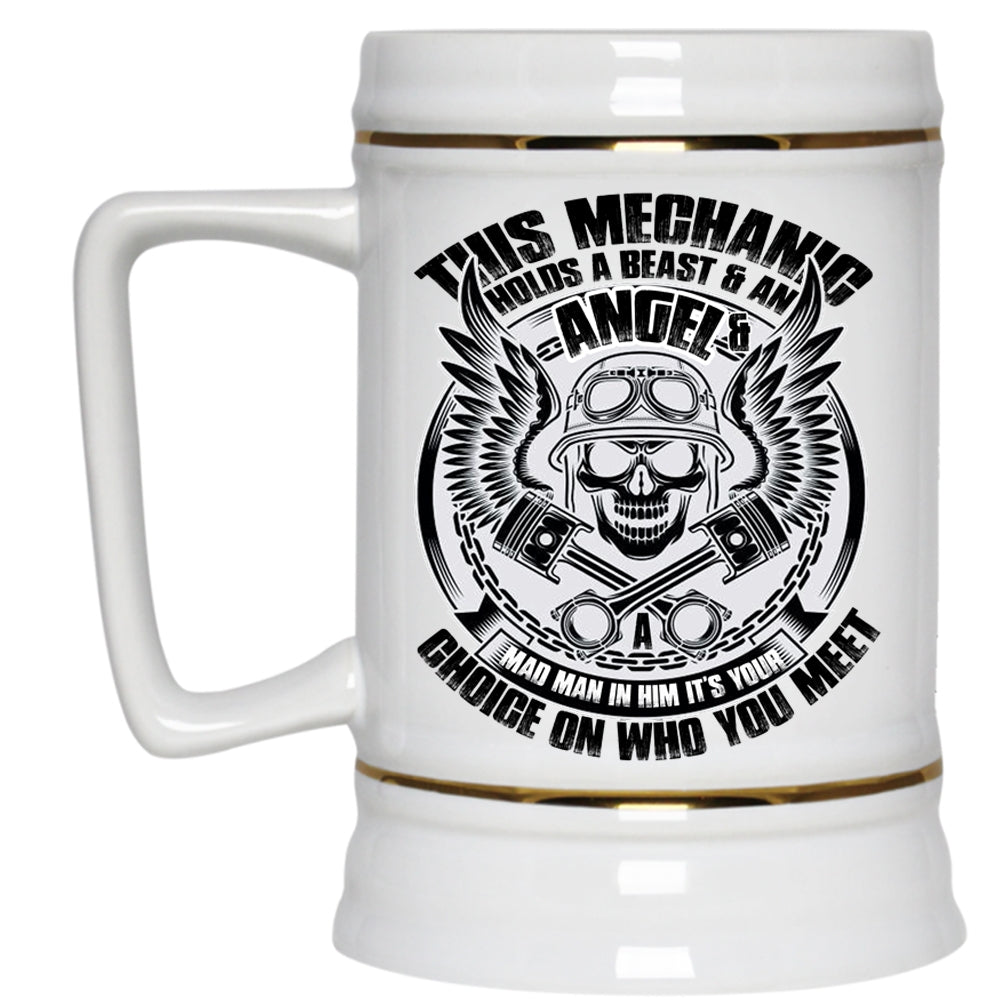 Cool Mechanics Beer Stein 22oz, This Mechanic Holds A Beast And An Angel Beer Mug