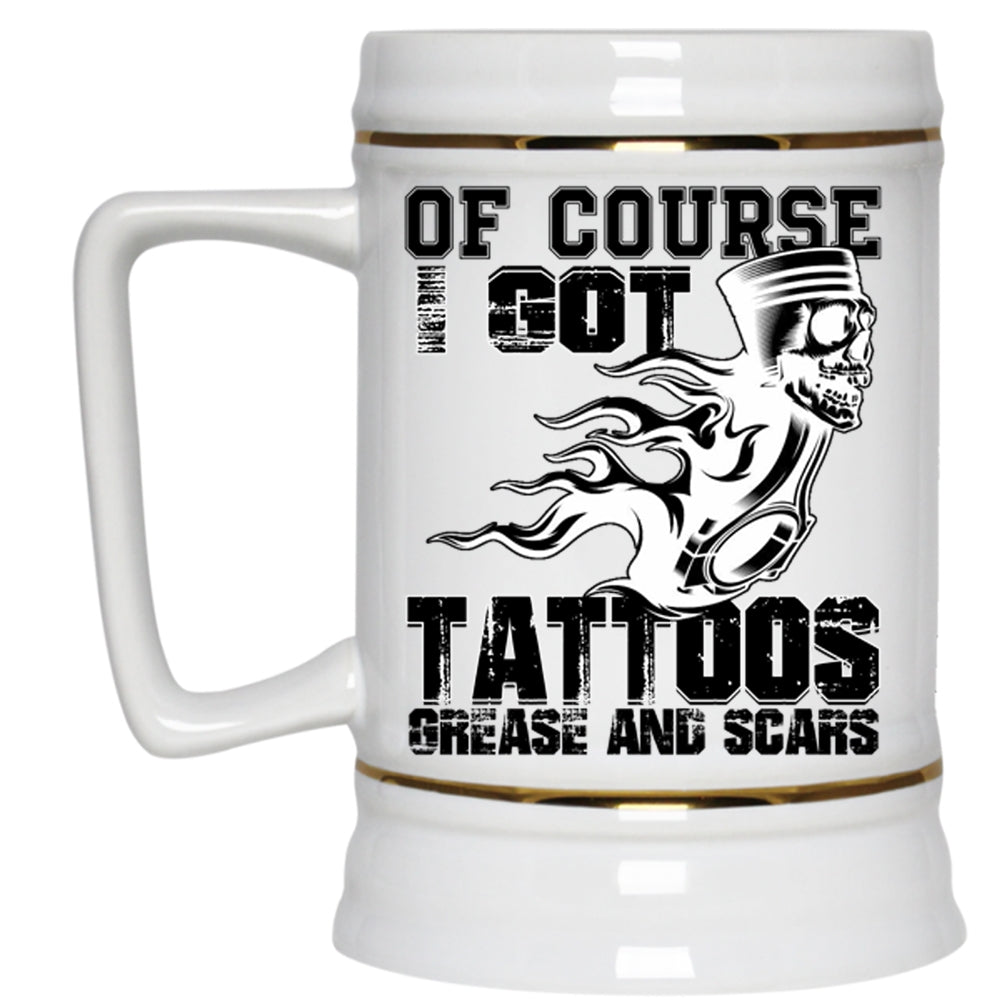 Funny Tattooed Mechanics Beer Stein 22oz, I Got Tattoos Grease And Scars Beer Mug