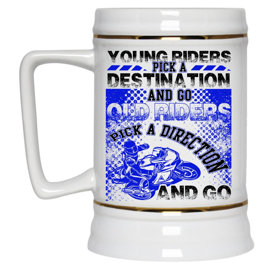Old Riders Pick A Direction And Go Beer Stein 22oz, Young Riders Beer Mug