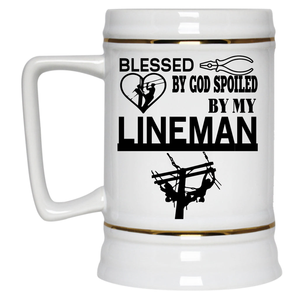 Cute Lineman Beer Stein 22oz, Blessed By God Spoiled By My Lineman Beer Mug