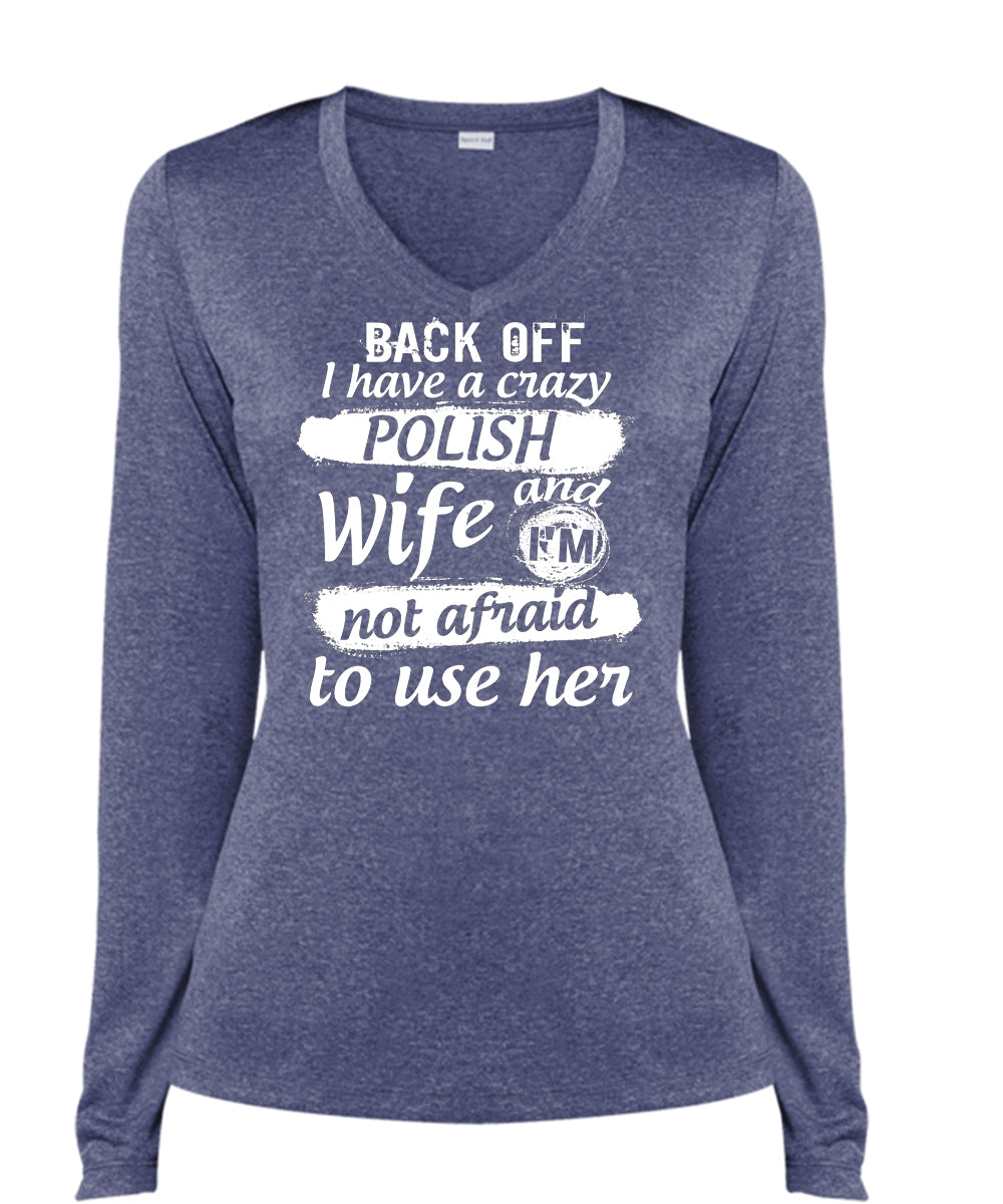 Back Off I Have A Crazy Polish Wife T Shirt, I'm Not Afraid To Use Her T Shirt (Ladies LS Heather V-Neck)