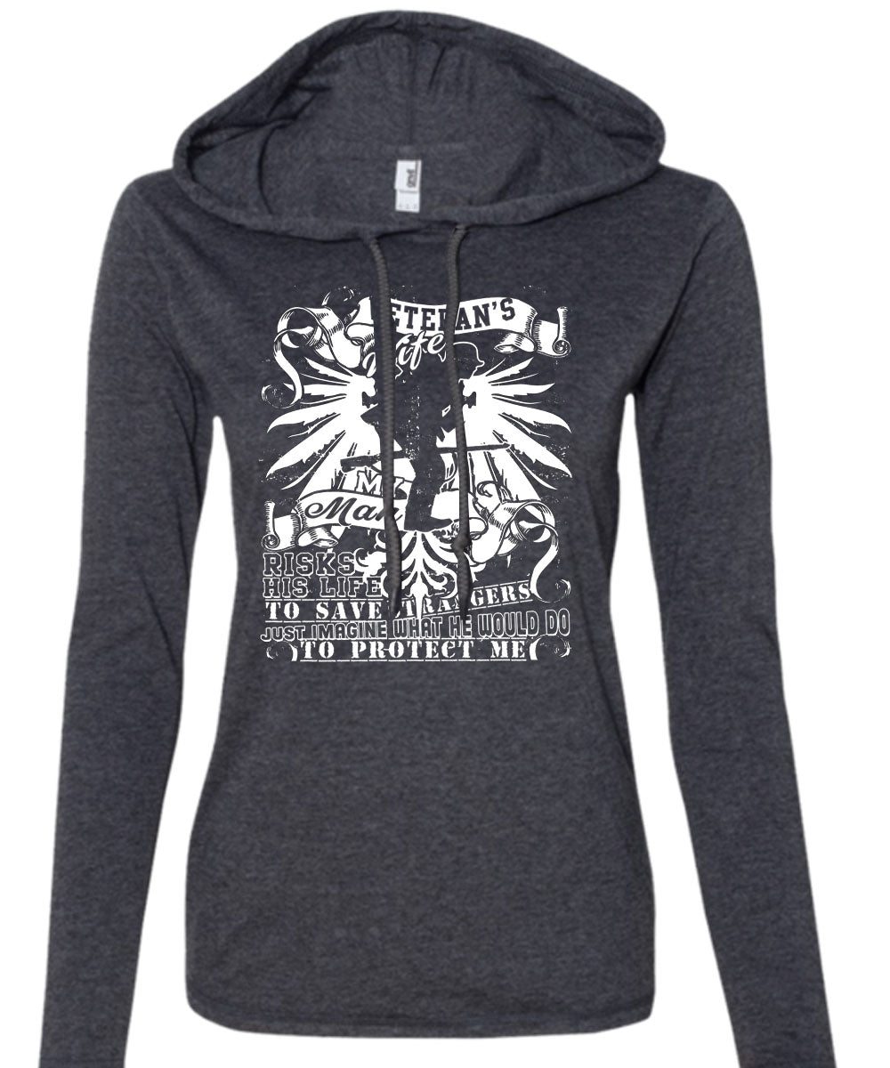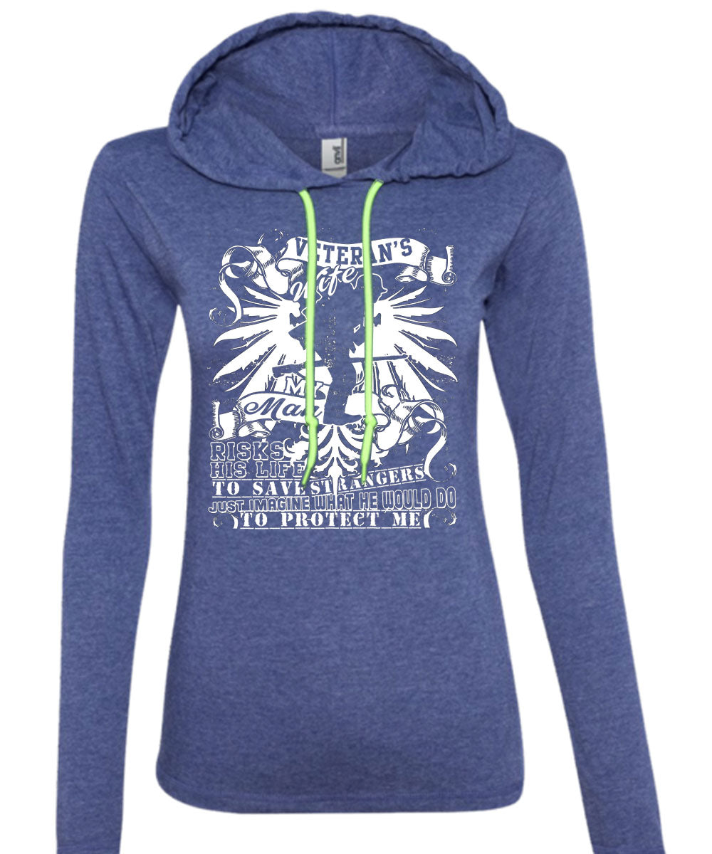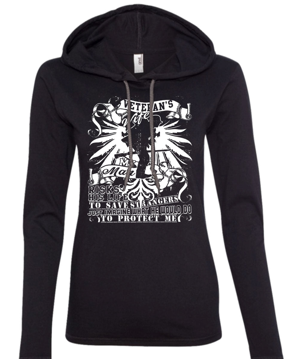 Being A Veteran's Wife T Shirt, My Man Risks His Life To Save Strangers T Shirt (Anvil Ladies Ringspun Hooded)