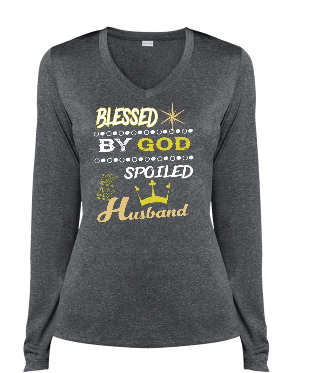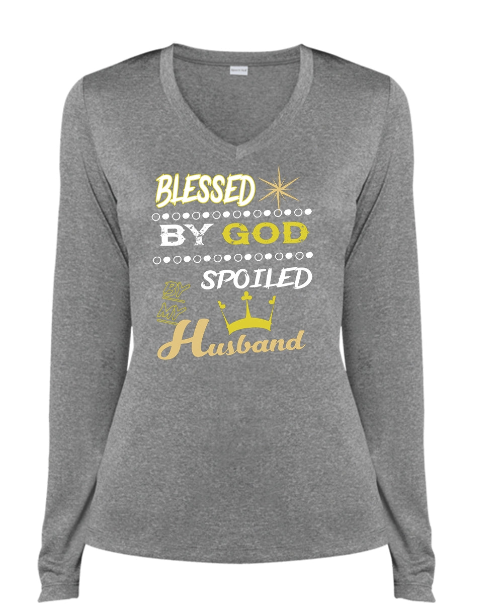 Blessed By God Spoiled By My Husband T Shirt, Just Married T Shirt (Ladies LS Heather V-Neck)